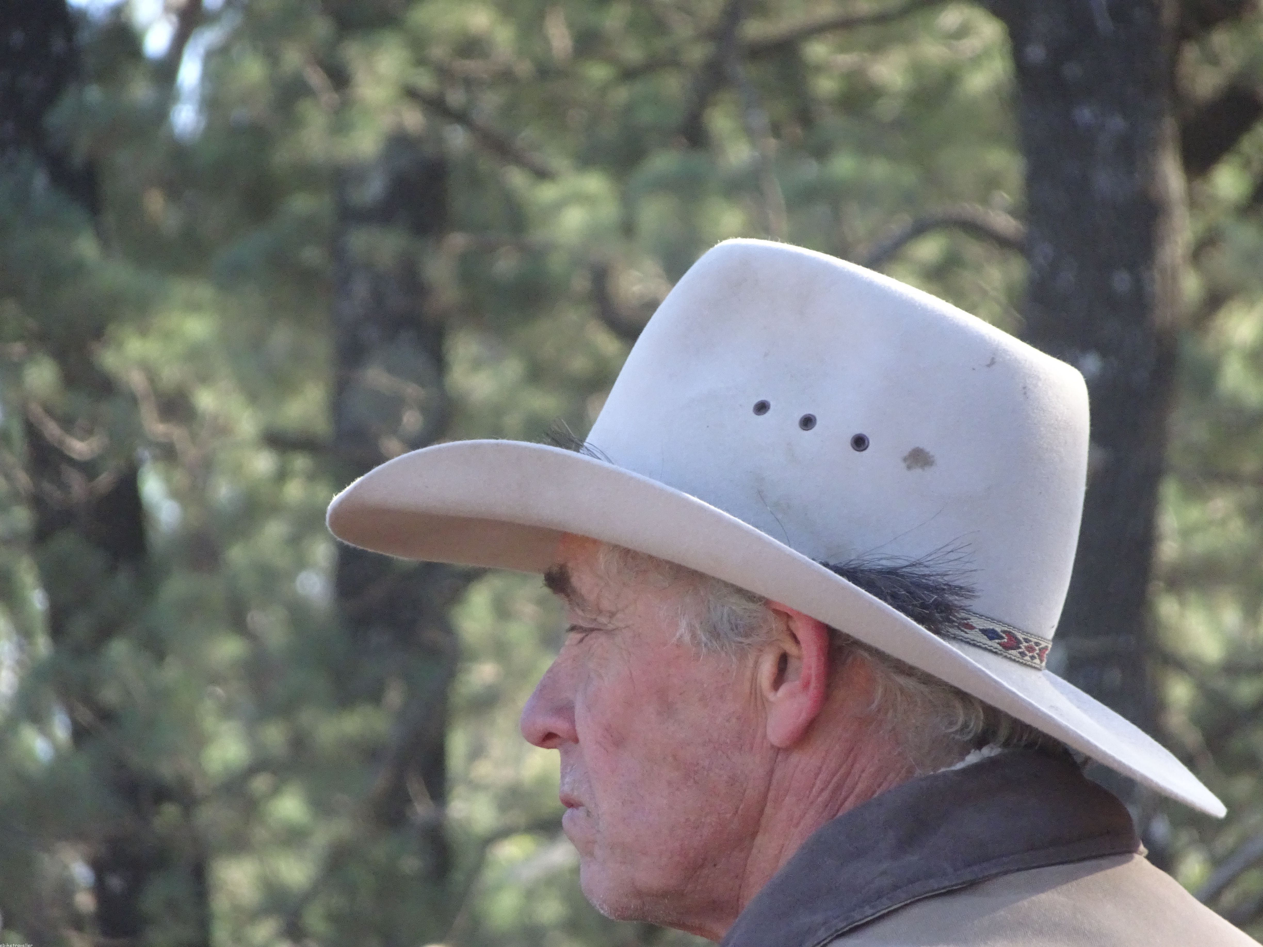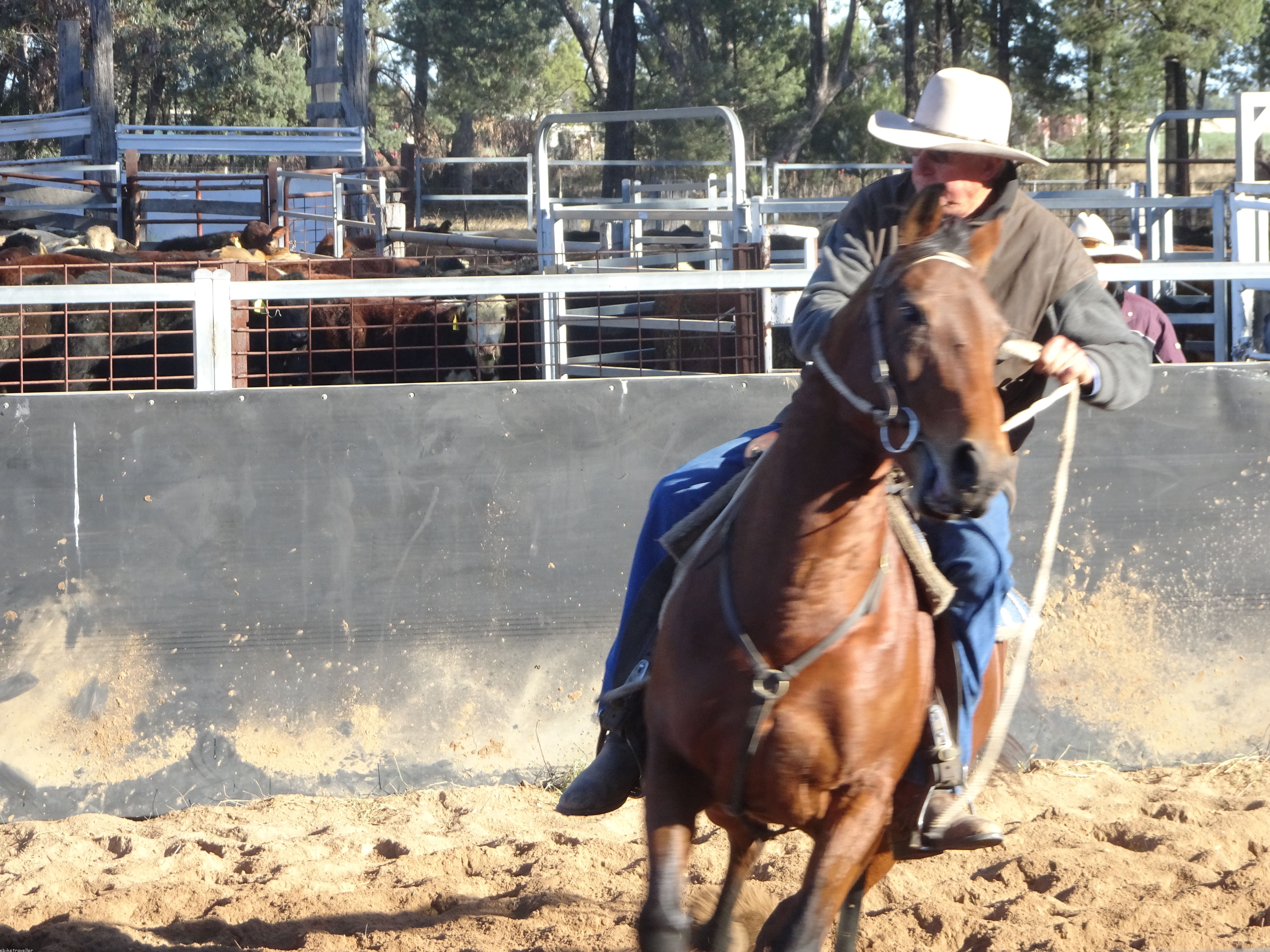 I did a roadside stop for an hour at 20 km past Coonabarabran to recharge and pushed on to Baradine, arriving at 10 to 5. An awful miserable place, and my first port of call, the pub, only confirmed the aura of desperation about the whole town. I was told the council caravan park 3km out of town might receive me, and they did. Not only that, but it was the one occasion of the year when the place was really hopping, due to the Baradine Camp Draft being held that weekend. People – well-heeled country folk, cow- and horse-people all – come from hundreds of miles around in their mighty impressive rigs of caravans and horse-floats, to compete, for little or no prize money, in corralling cattle over a set course on their horses. Bit like a grown-up version of Babe mustering sheep. Actually, they select one out of a herd of 7 cows penned into a small area, cut it out of the herd and then try to make it go around a figure of 8 course in the main arena.