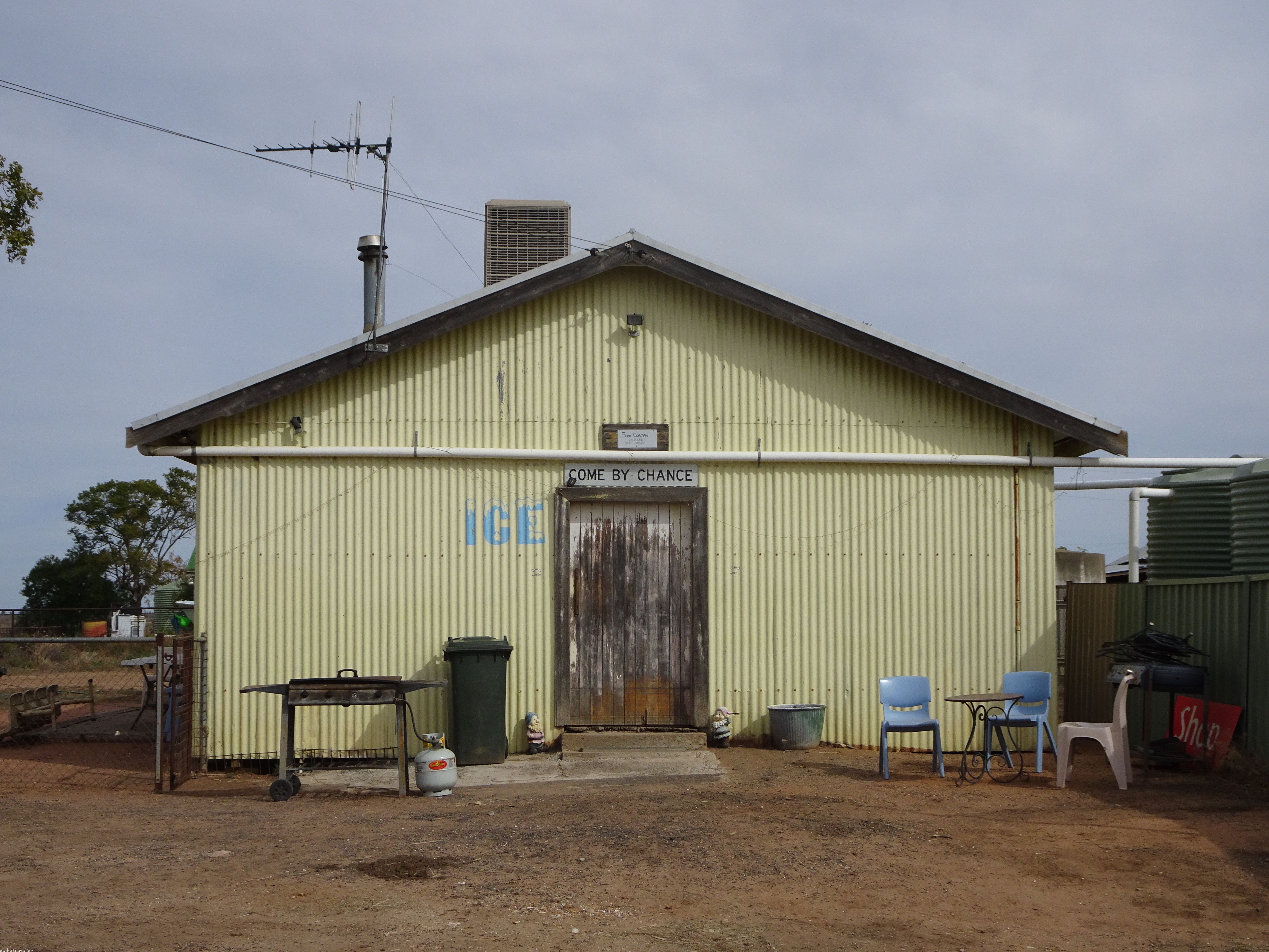 Into Pilliga for another expensive steak sandwich and a couple of iced coffees, then hurtled off along 60 km of straight flat black-soil road through the quaintly-named locality of Come-by-Chance.