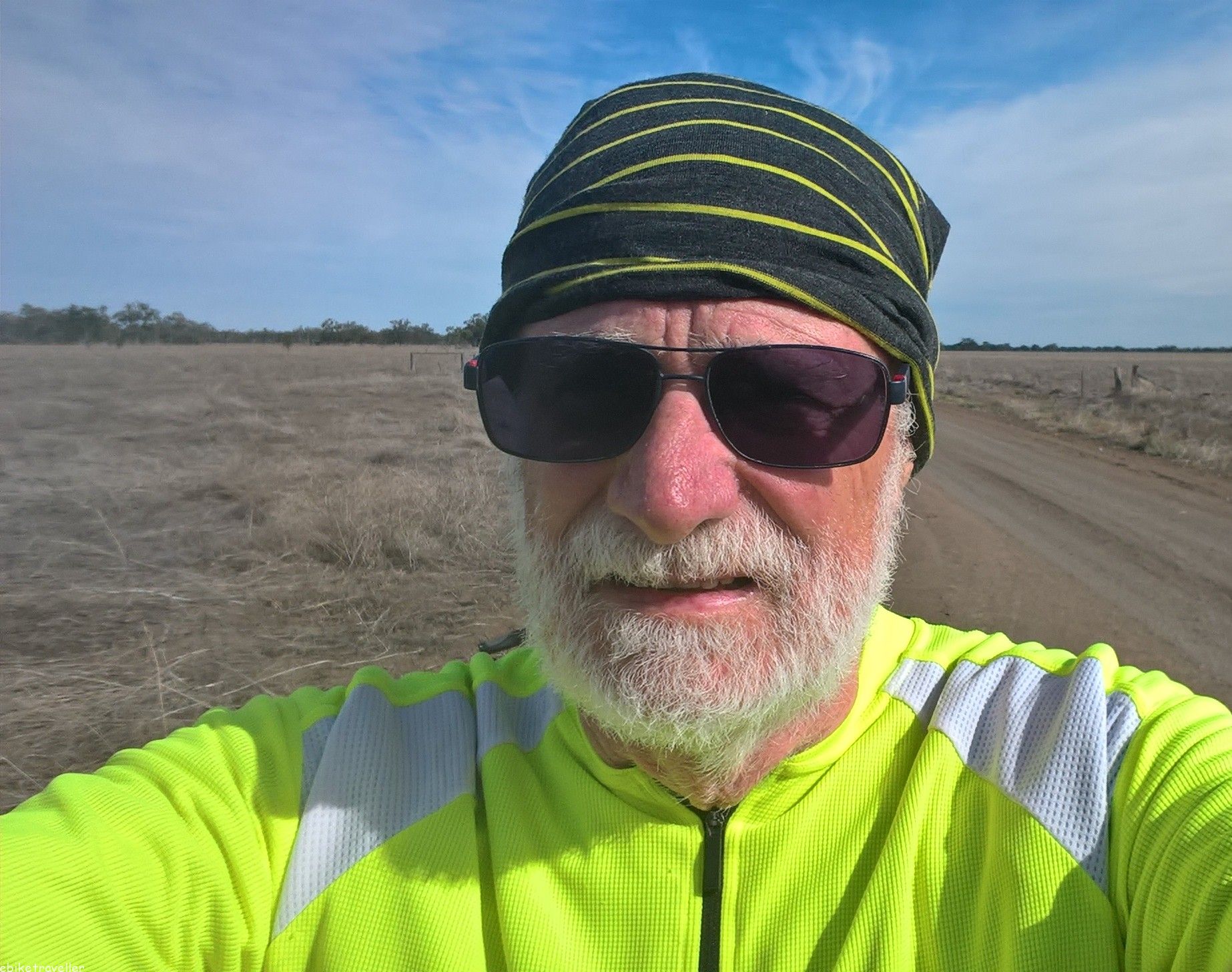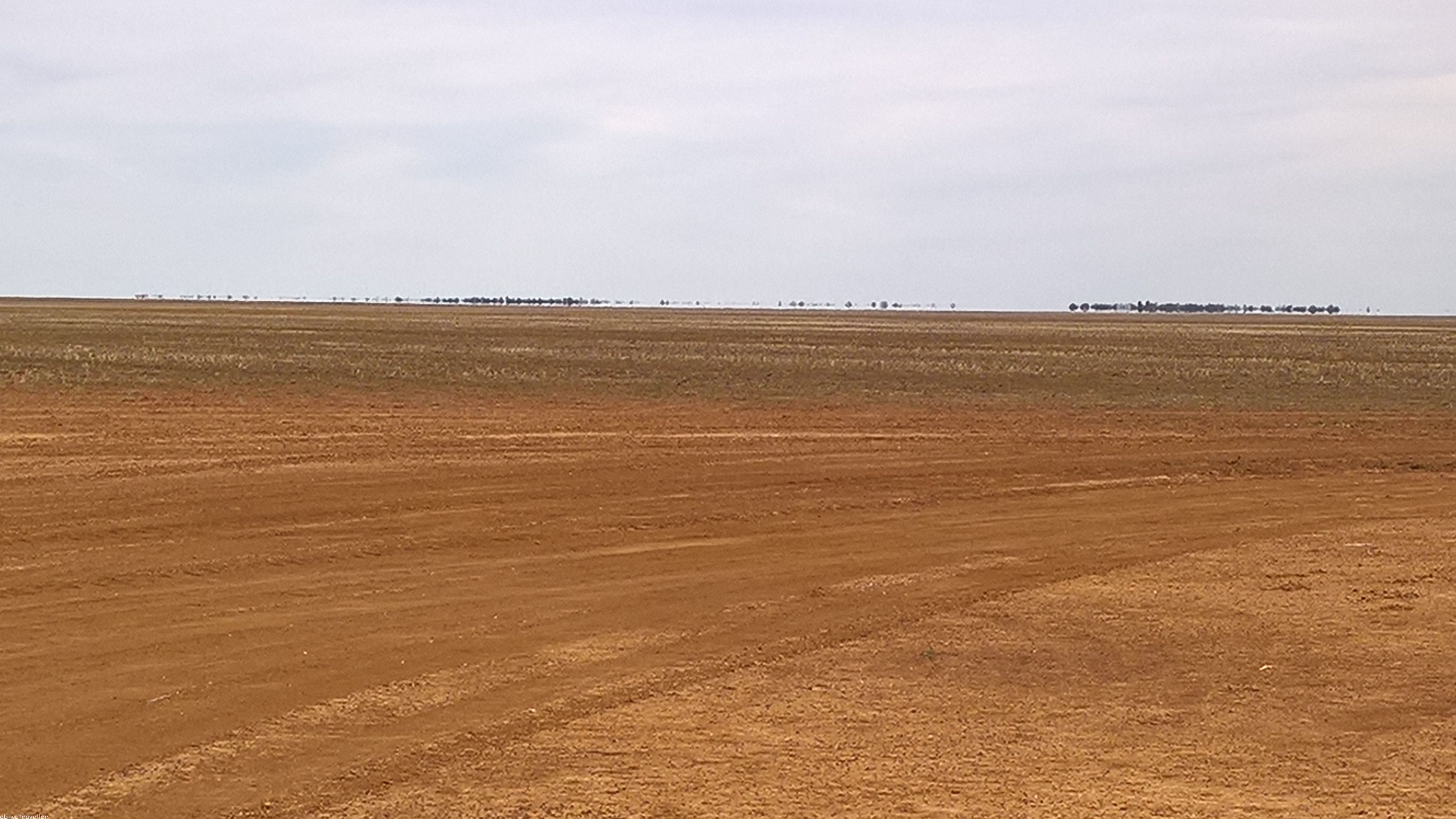 [The first half of the day was great – the best yet: no traffic, good road, straight and flat. Then I hit the dirt section, and it wasn’t good dirt either: loose gravel on a high camber, so neither traction nor direction were ever under complete control, which became problematical whenever another vehicle came by in either direction (there weren’t many, but positively peak hour compared to the earlier part on the good stuff)]