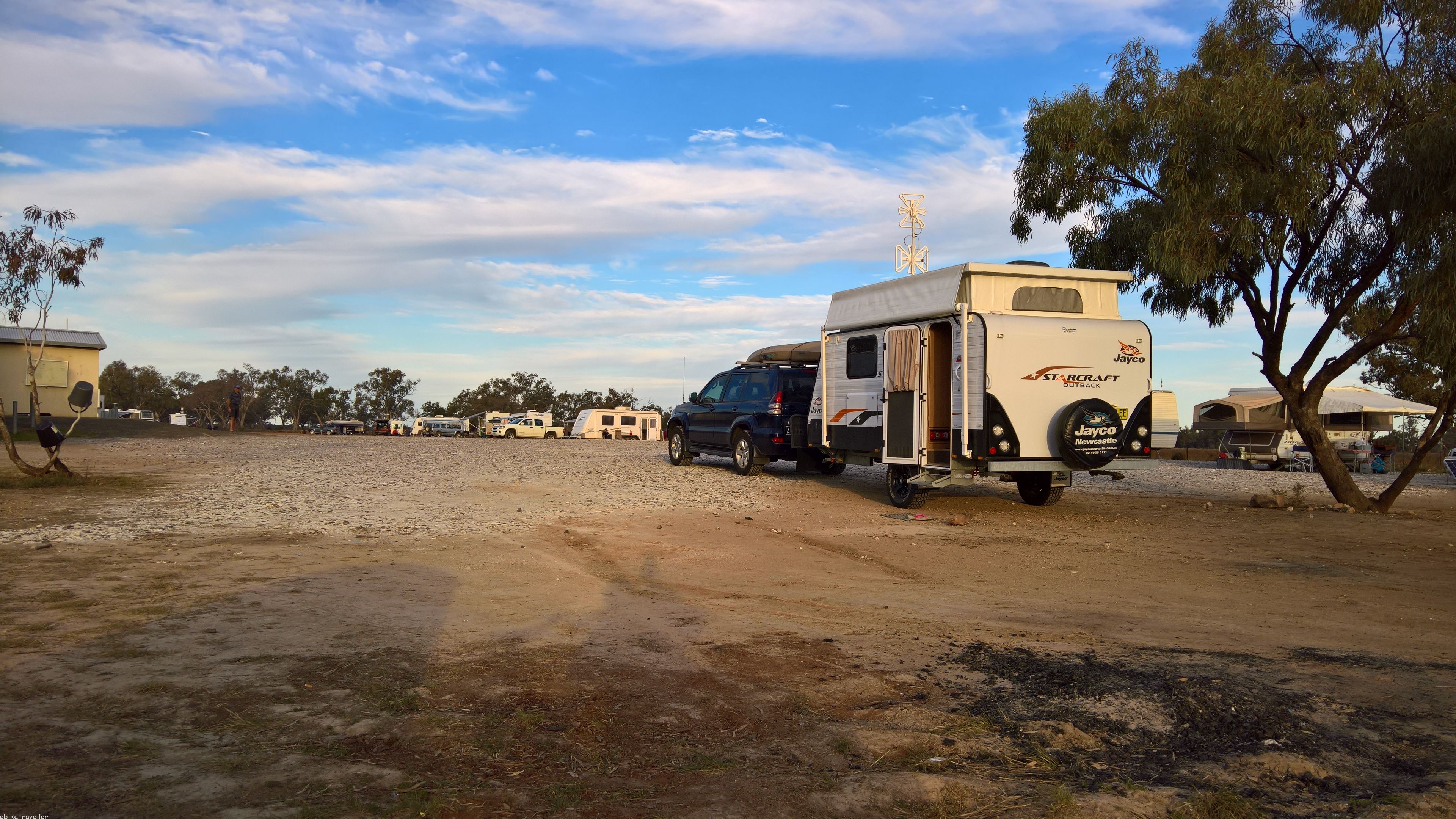 I ducked into town (5km round trip) for an exorbitantly-expensive steak sandwich and some cool drinks. And had lots of swims in the hot spring. Camp site is a bit so-so. Not so attractive and all fine white dust.
