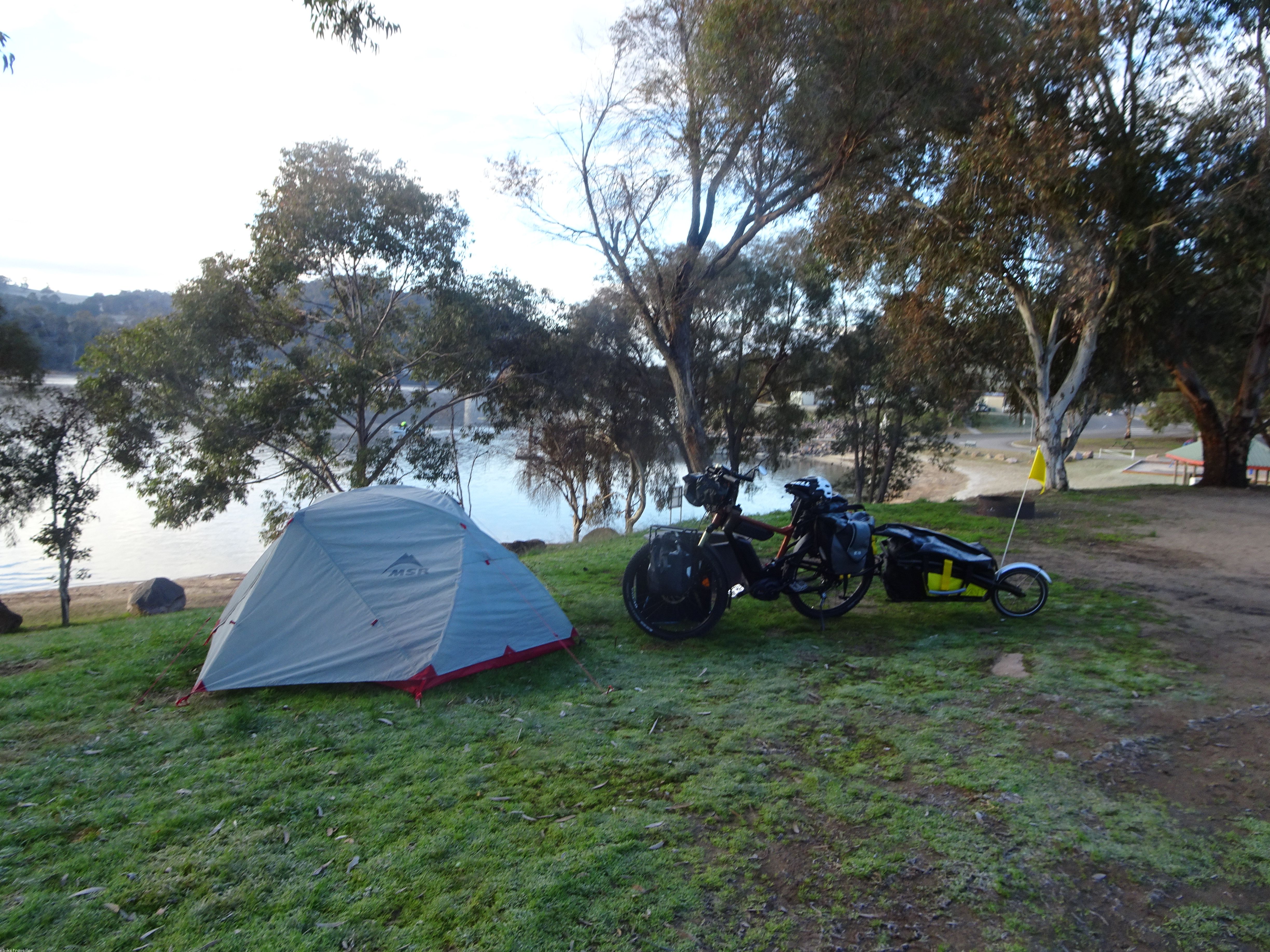 It was only 26 km but a scary, hilly and exhausting ride in my unconditioned novice state to Lake Lyall via Lower Benfells (where I woofed down a steak pita, the only food I’d eaten all day in my state of nervous excitement), and I arrived completely frazzled at dusk (5.20pm) into the lake campsite. It was cold – damned cold – and so it was straight into the tent by 6pm in all available layers of clothing, and inside a double-layered sleeping bag (where I found, crumpled up between layers at the bottom, the ‘lost’ pair of PJs that I had just spent 2 hours unnecessarily replacing).