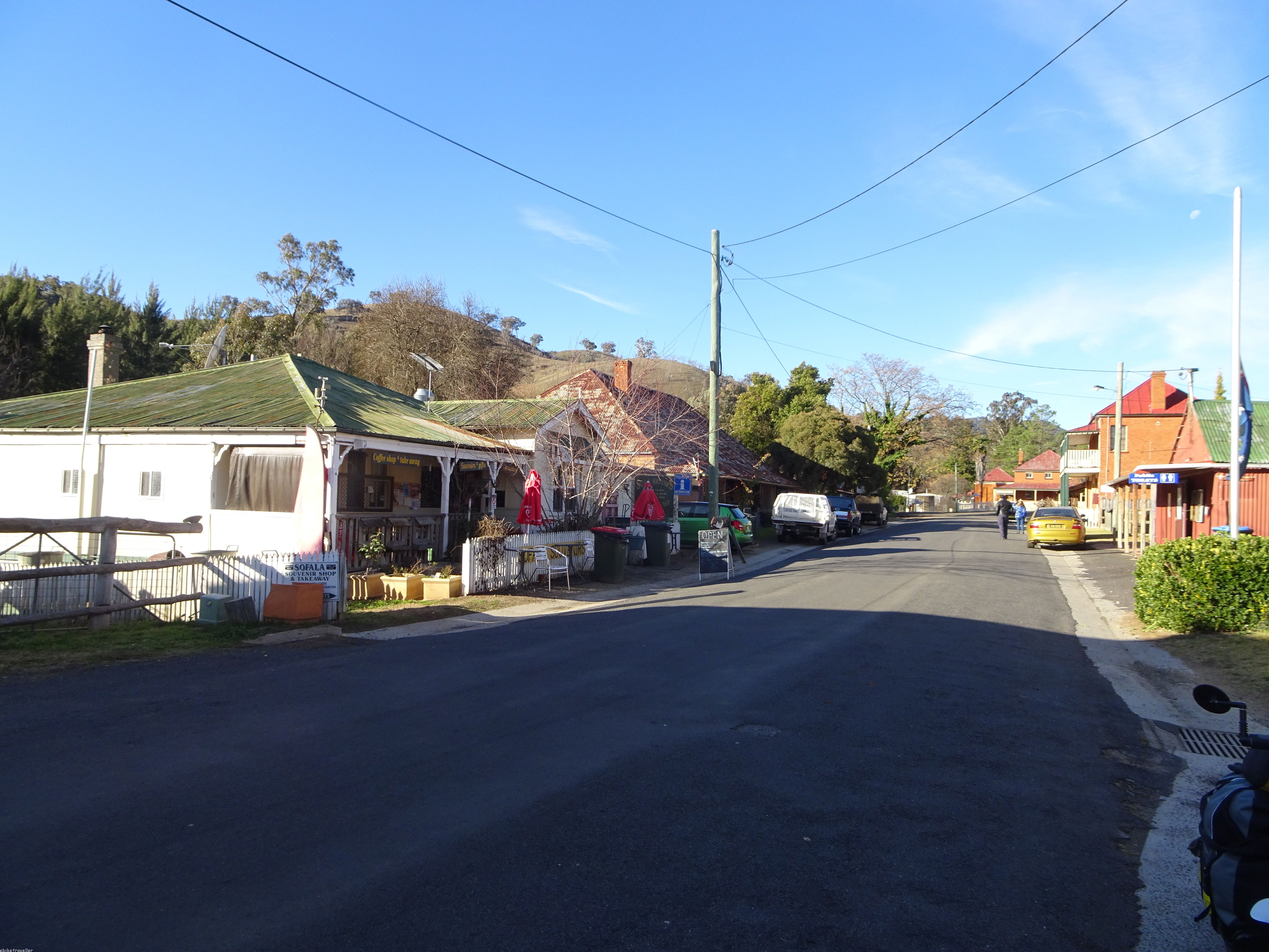But anyway, oh good – now a chance to finally try out the new en-route recharging capability afforded by my blue suitcase generator. This I duly proceeded to do, at a non-descript location behind a heap of road-gravel on a slight bend at the bottom of a big hill. Using a double-adaptor I charged both batteries simultaneously for 2½ hours and restored about 4 bars of battery (that is, 4/5ths complete charge), and completed the remaining 17 km into Sofala, including the very steep and long 5km climb into Wattle Creek, by 4pm.