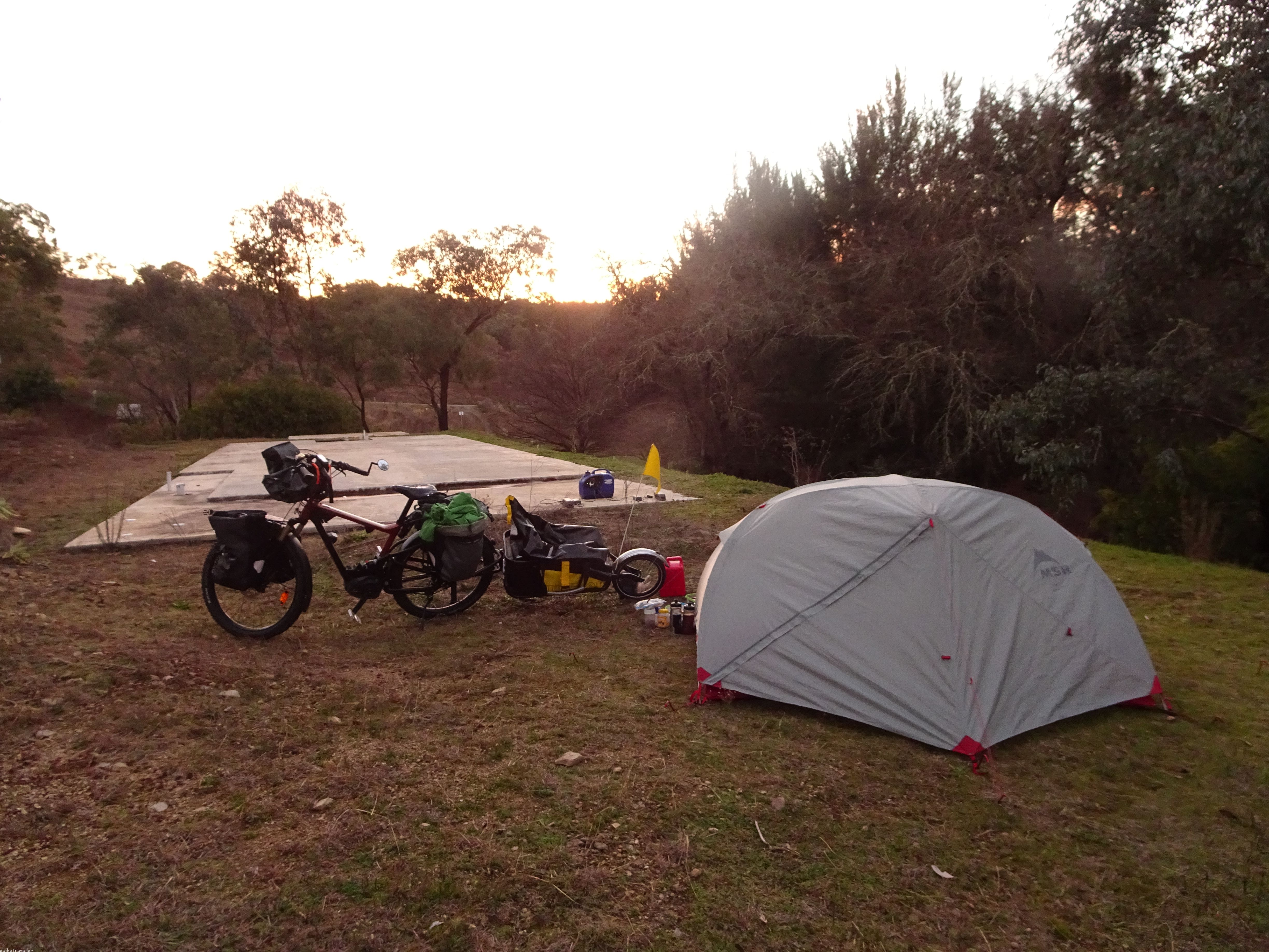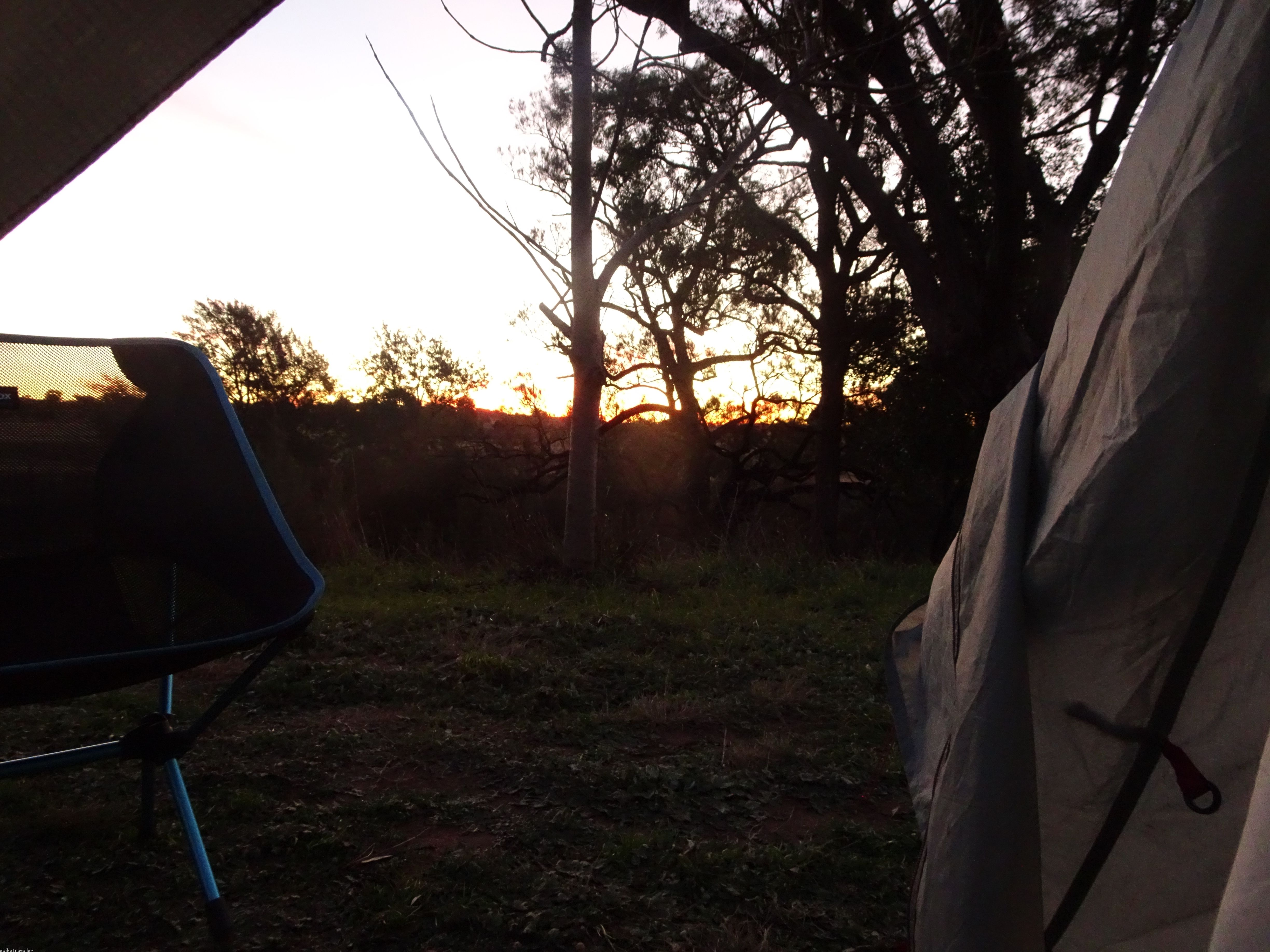 In spite of the improved range, I did still need a road-side re-charge using the genny for an hour before Dunedoo, where I arrived at 4pm and booked a tent site at the council caravan park for $20, after trying for a room at the pub (only $35, but fully booked-out). It was a nice spot in the caravan park too, right adjacent to the open-sided camp kitchen, which I was able to make use of to spread out all my belongings. But on the downside, my tent was pitched right under a bright street lamp, and the campground itself was afflicted by the noise of big trucks thundering past all night long.