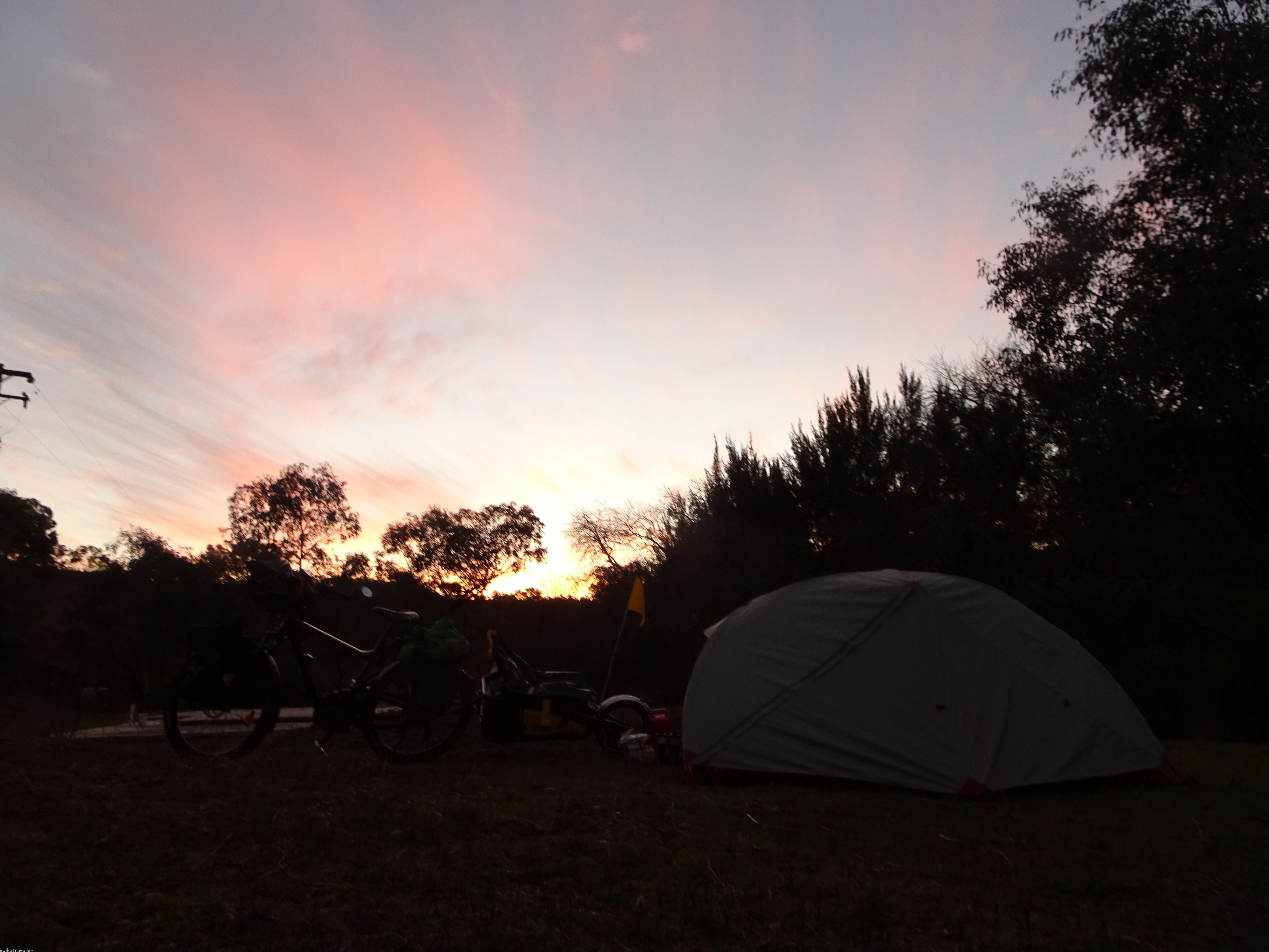 I had to wait an hour this morning for everything to thaw out (including me!) but finally got away at 9.30, stiff and tired and well rugged-up, but soon started shedding gear as the day warmed up. Not much sleep due to that bright area-lighting pole next to the tent and those big trucks whizzing through town all night long, but glad to be adjacent to the camp kitchen area where I could spread out all my stuff to get organized without worrying about it getting too wet from the heavy dew. Overall, my first night’s paid accommodation was well worth the $20.