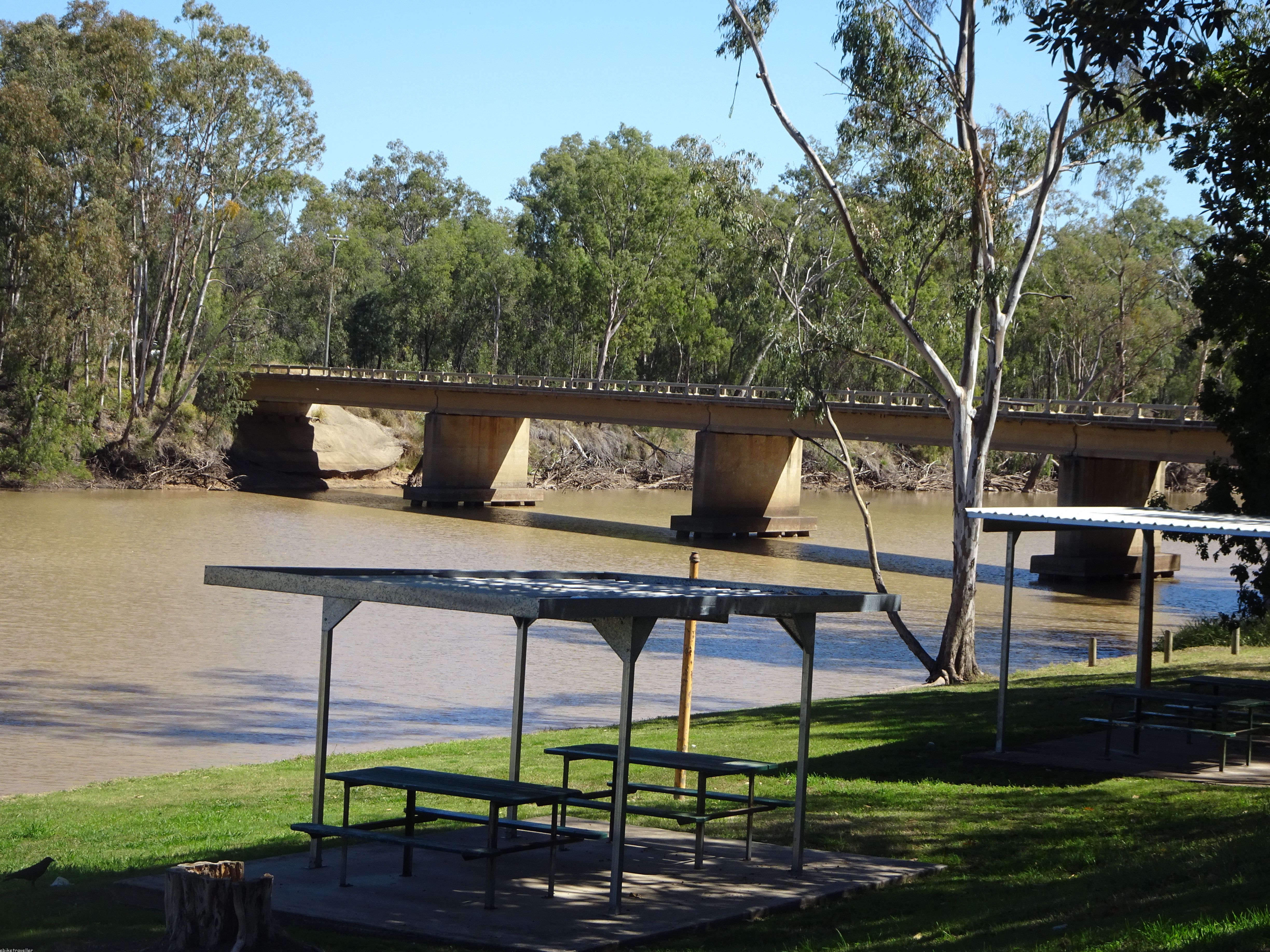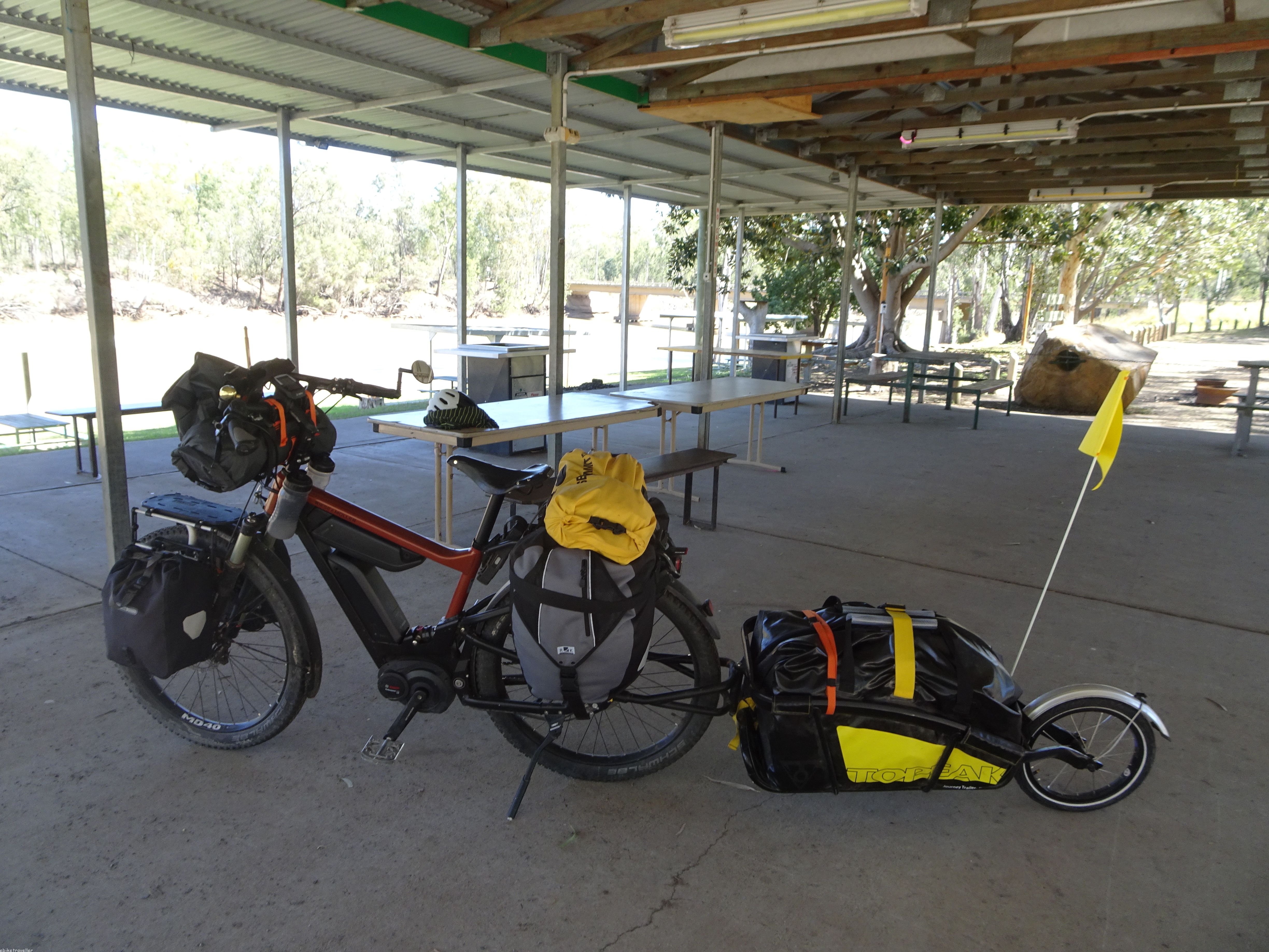 Easy-peasy ride into Moura – though there was one ginormous hill to conquer – and I scooted in by 1pm. Once again, in my delicate psychological state I found I needed another treat day, and so I opted for a motel unit, this one at the Moura Meridian being a bit swanky, though at a heavily-discounted rate ($130) “…’cause all the reps go home on weekends” (it being a mining town). But if I thought I’d be rocking into Moura and hitting the town on a Friday night, I was sadly mistaken. It was completely dead by 6pm and I had Chinese in front of the tele back in my room. Ah well.