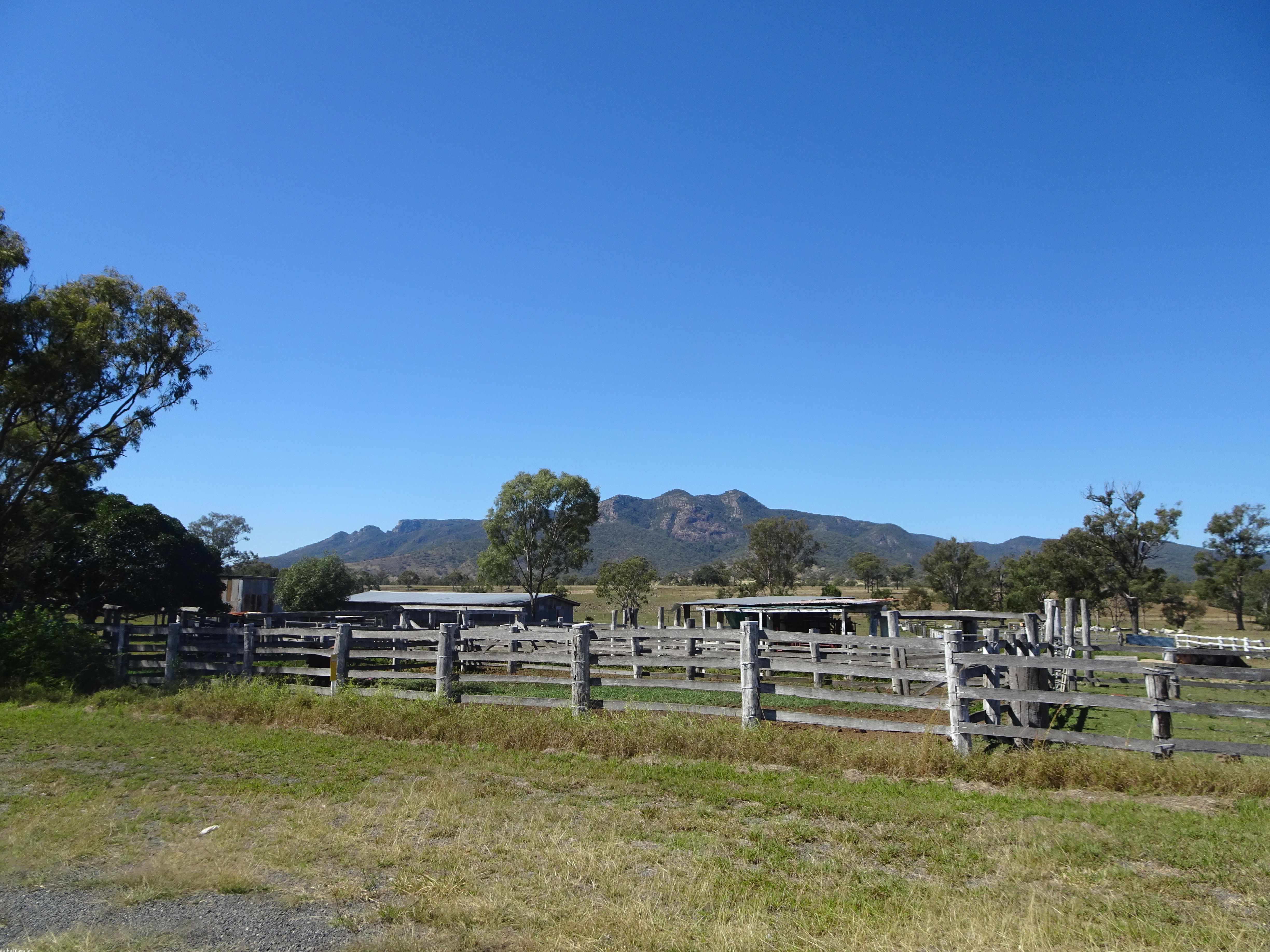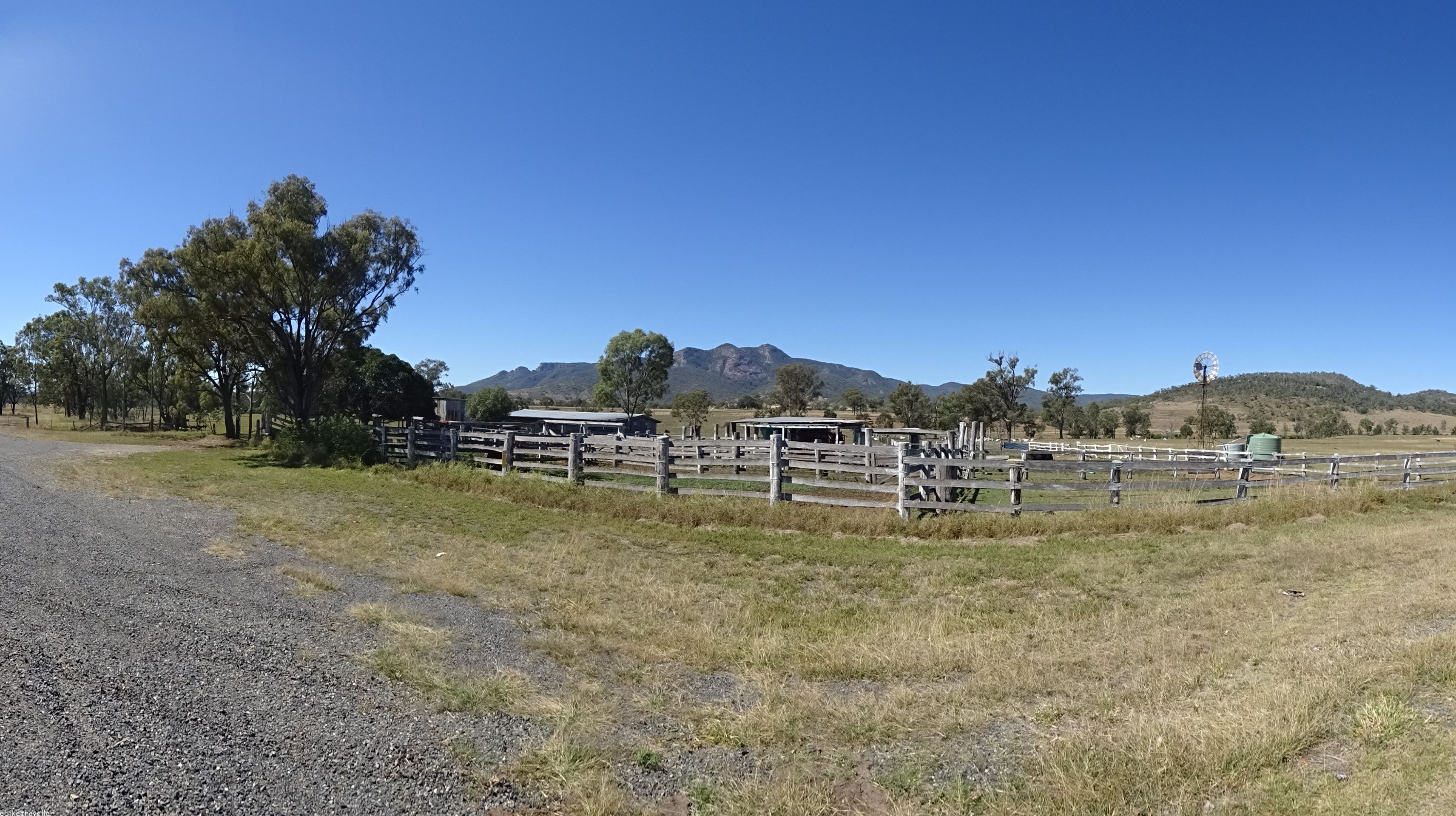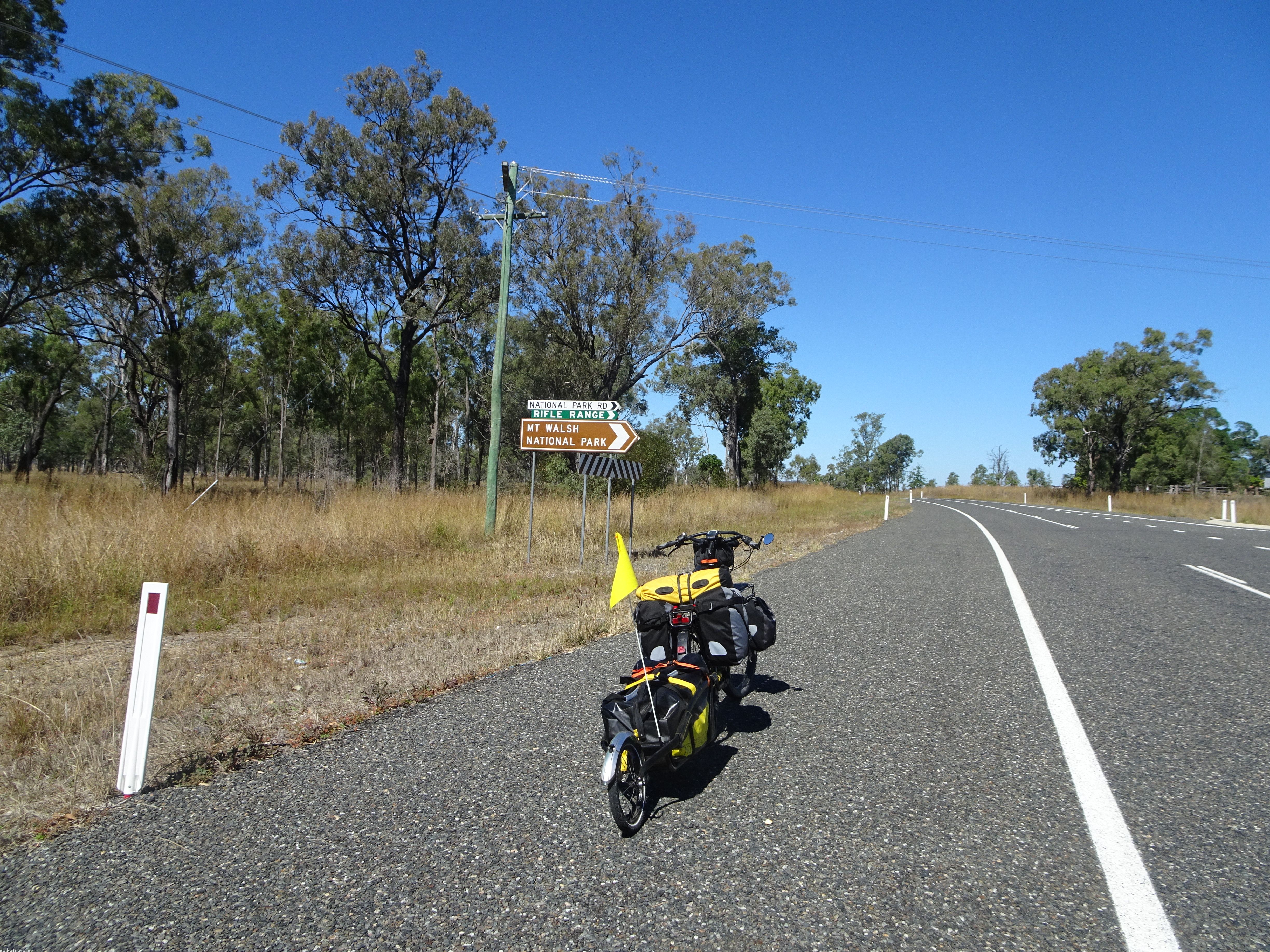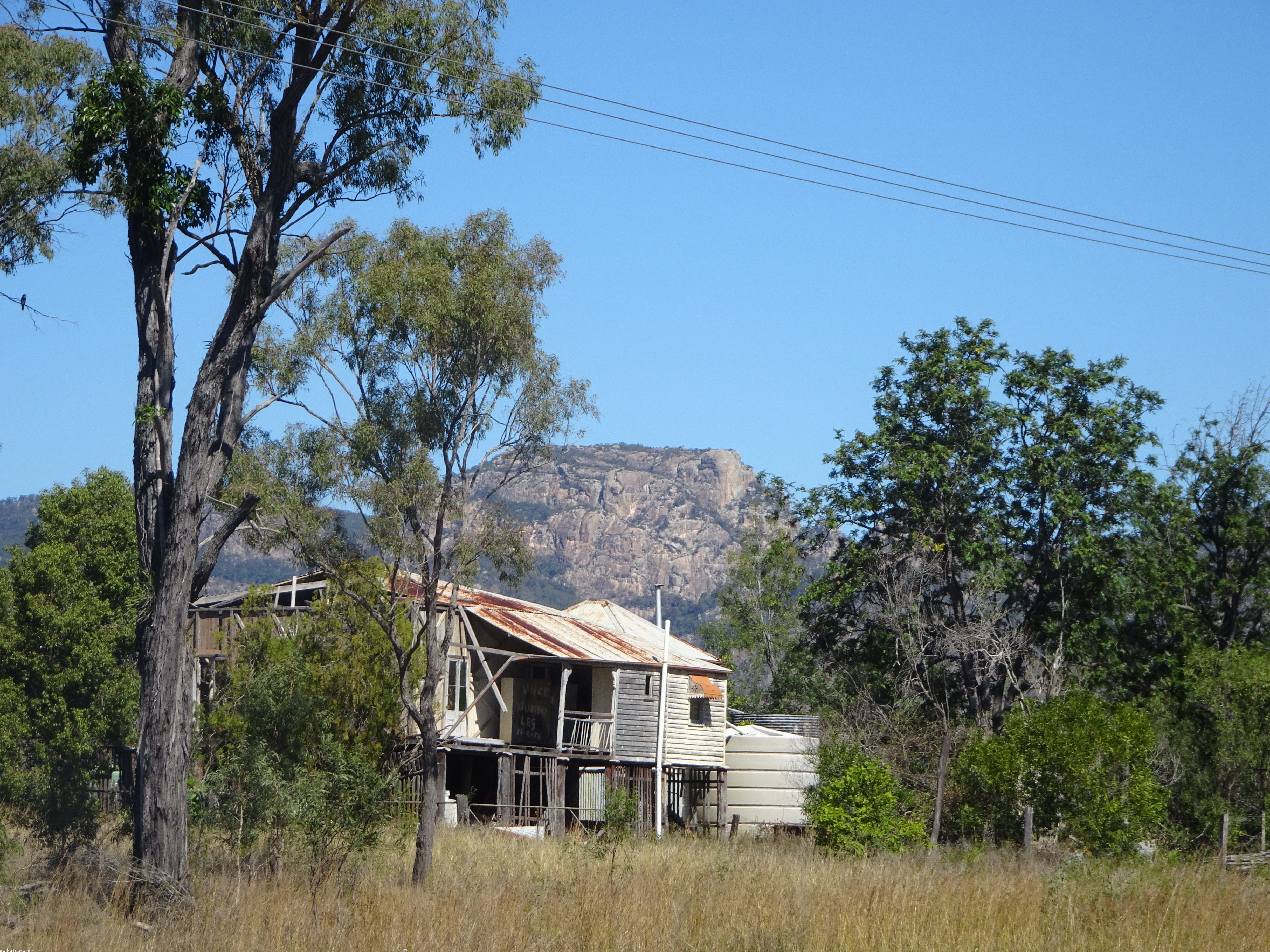 From Gayndah I made easy going to Ban Ban Springs within 2-hours and then on to Biggenden by 12.30, where I had a crappy counter lunch in a pub. After that, I had a roadside charge-up session for an hour about an hour out of Biggenden on a terrible section of road, and afterwards anxiously plowed on looking for a likely night stopover place. My bike chain had obviously stretched to a critical point and it slipped off the rear cog three times on this section, once dangerously so whilst going up a steep hill with no verge, and I had to lay the bike down on the roadway to get the chain back on. Fortunately this is relatively easy to do with a Rohloff single-speed chain.