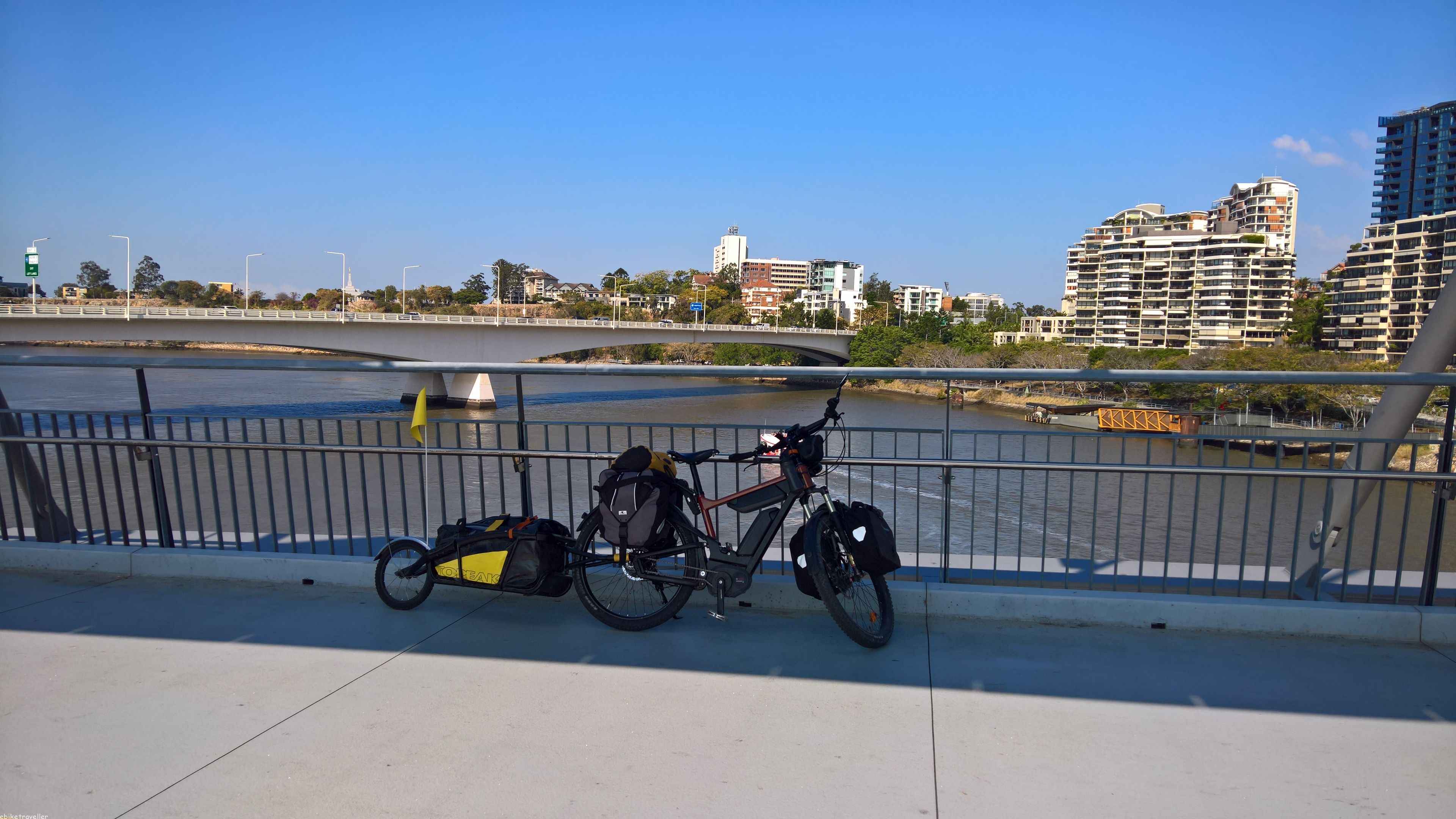 Still, I made it to Brisbane Electric Bikes in Milton by 11.30, where Rio and Alex did a bit of work on the bike for me: first new chain at 4,515 km on the odometer – they were amazed it lasted so long – and a ‘new’ second-hand kick-stand from off a Dominos Pizza delivery bike.