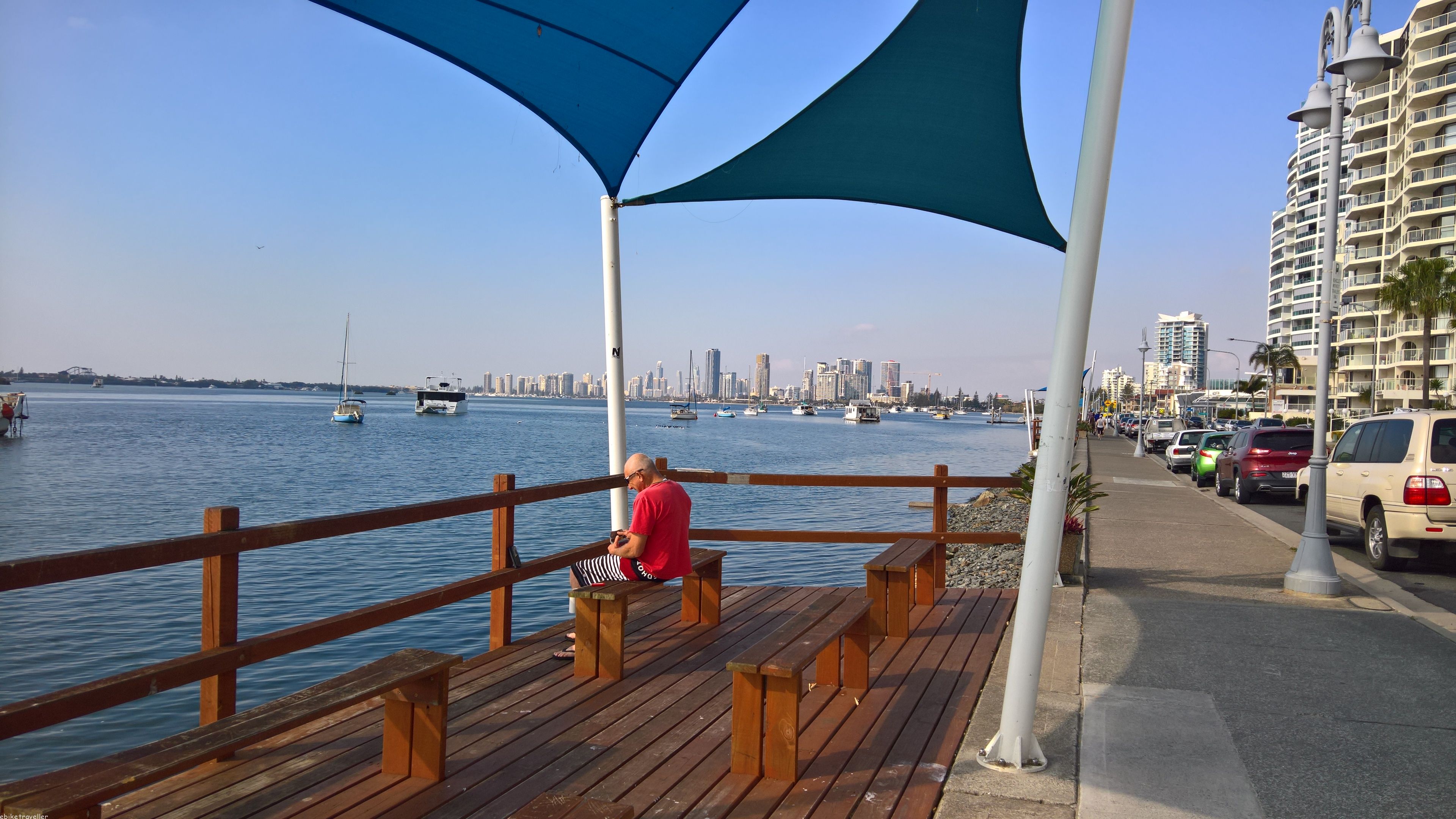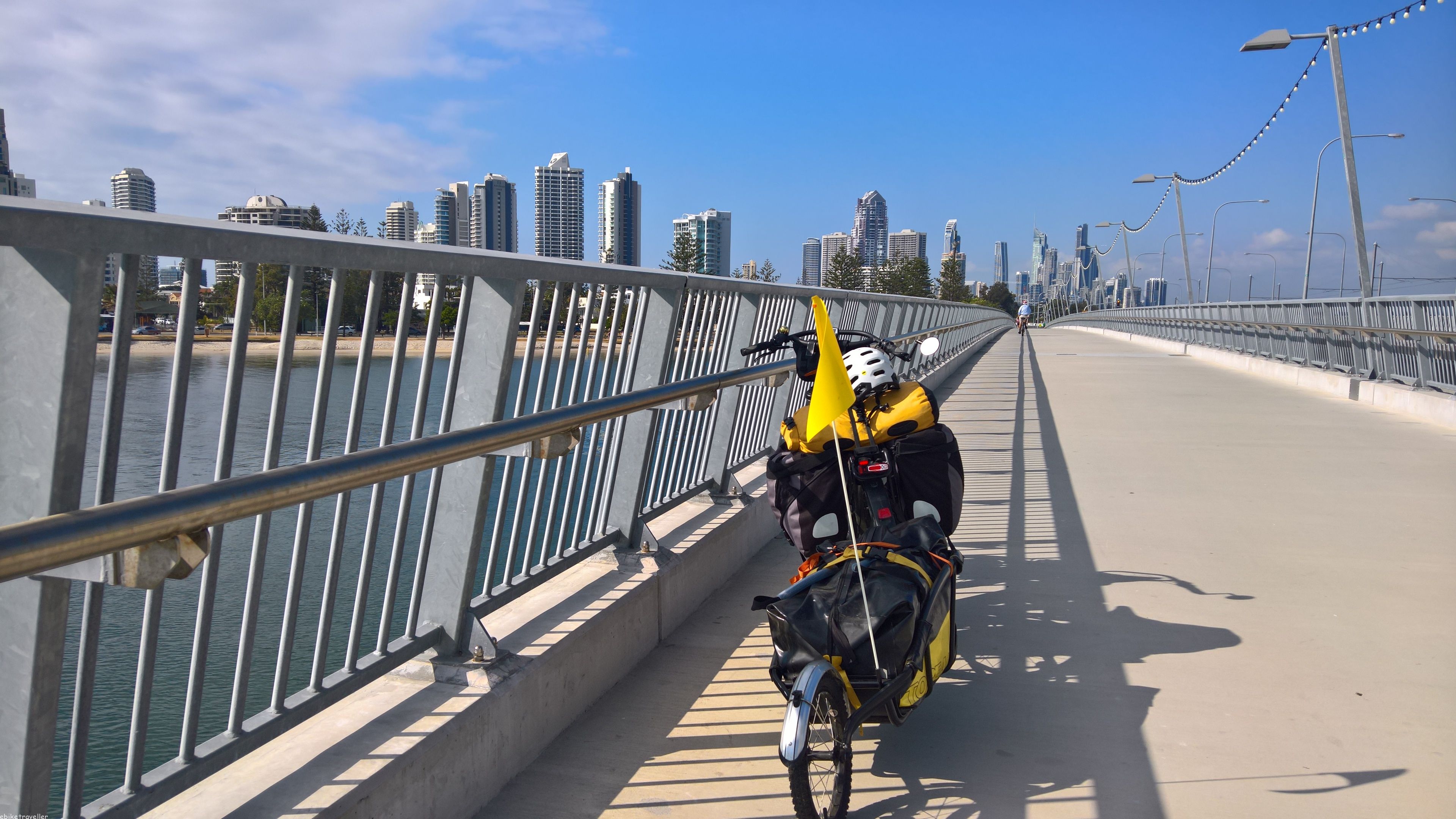 The cycle paths in inner Brisbane are great, but the nightmare continued in terms of finding a viable route out of the city to the Gold Coast. At 4.30 I’d had enough and pulled in to a vacant lot behind Woolworths at Beenleigh and just slept on the ground. There was already a young Belgian guy there sleeping in his station wagon and surviving by dumpster-diving into the supermarket bins. He offered me some of an enormous quiche that was ‘only a few days old’, which I respectfully declined, but he and I did share 4 cans of Jack Daniel and coke premix that I went and bought at the local Sip ‘n’ Save.