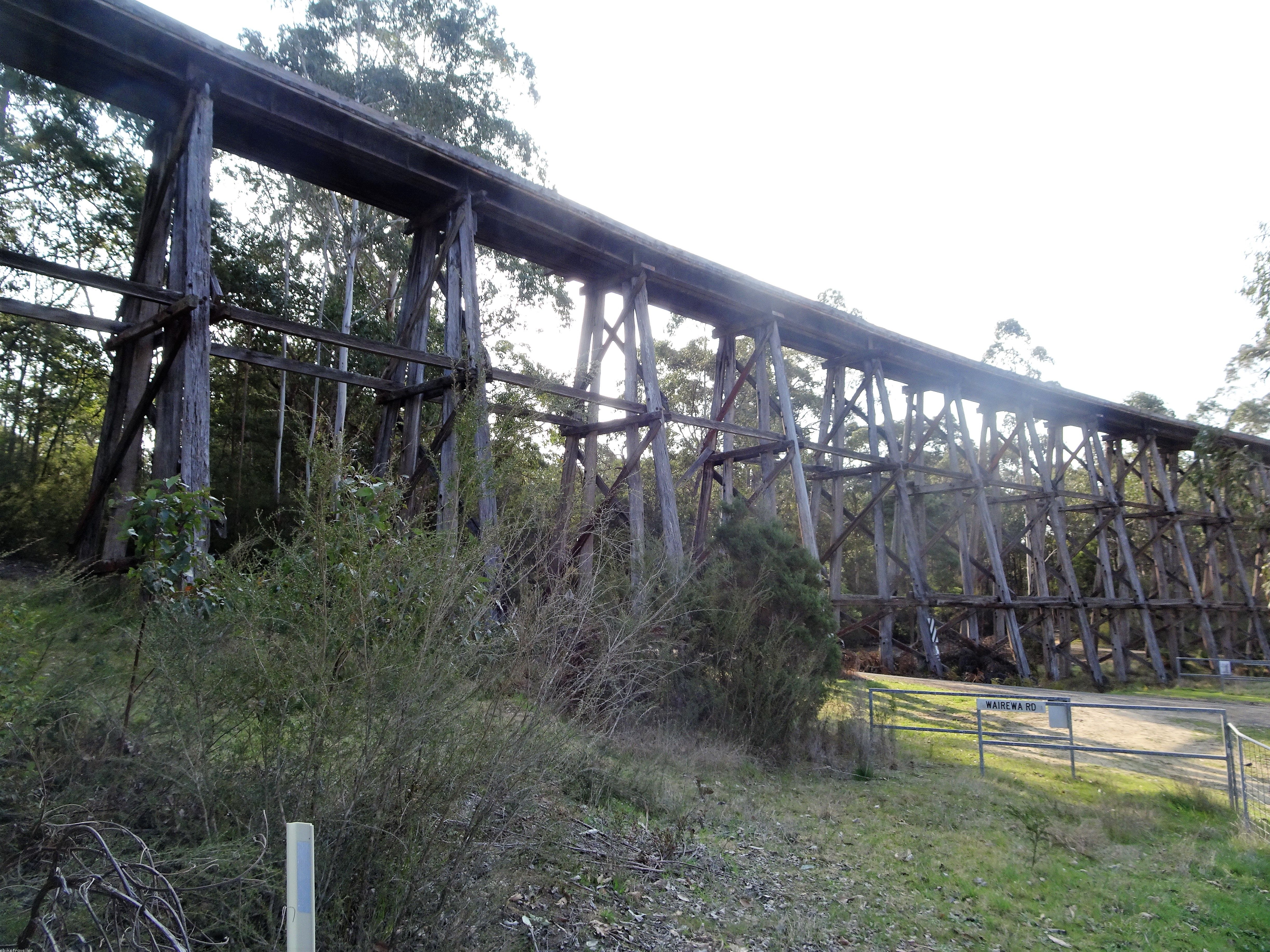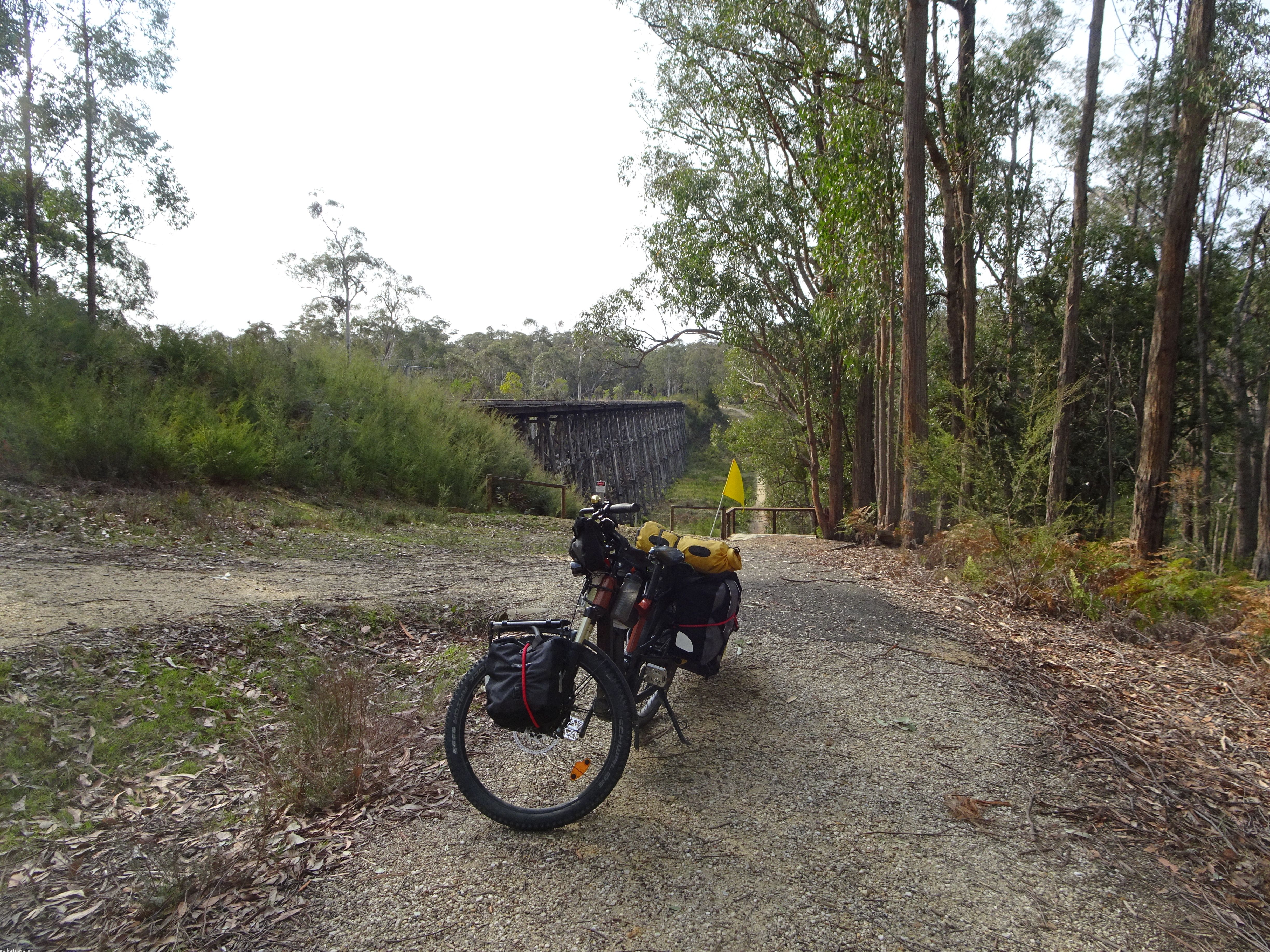 The first 40km were easy – mostly hard-packed gravel – but after that the track surface began to deteriorate, with steep ravines to negotiate around trestle bridges and some fallen trees across the track.  I made it as far as Nowa Nowa and camped in the very basic caravan park there, but at least I was able to buy a lovely gourmet brekkie of ham, cheese and onion toasties from the park-owner next morning.