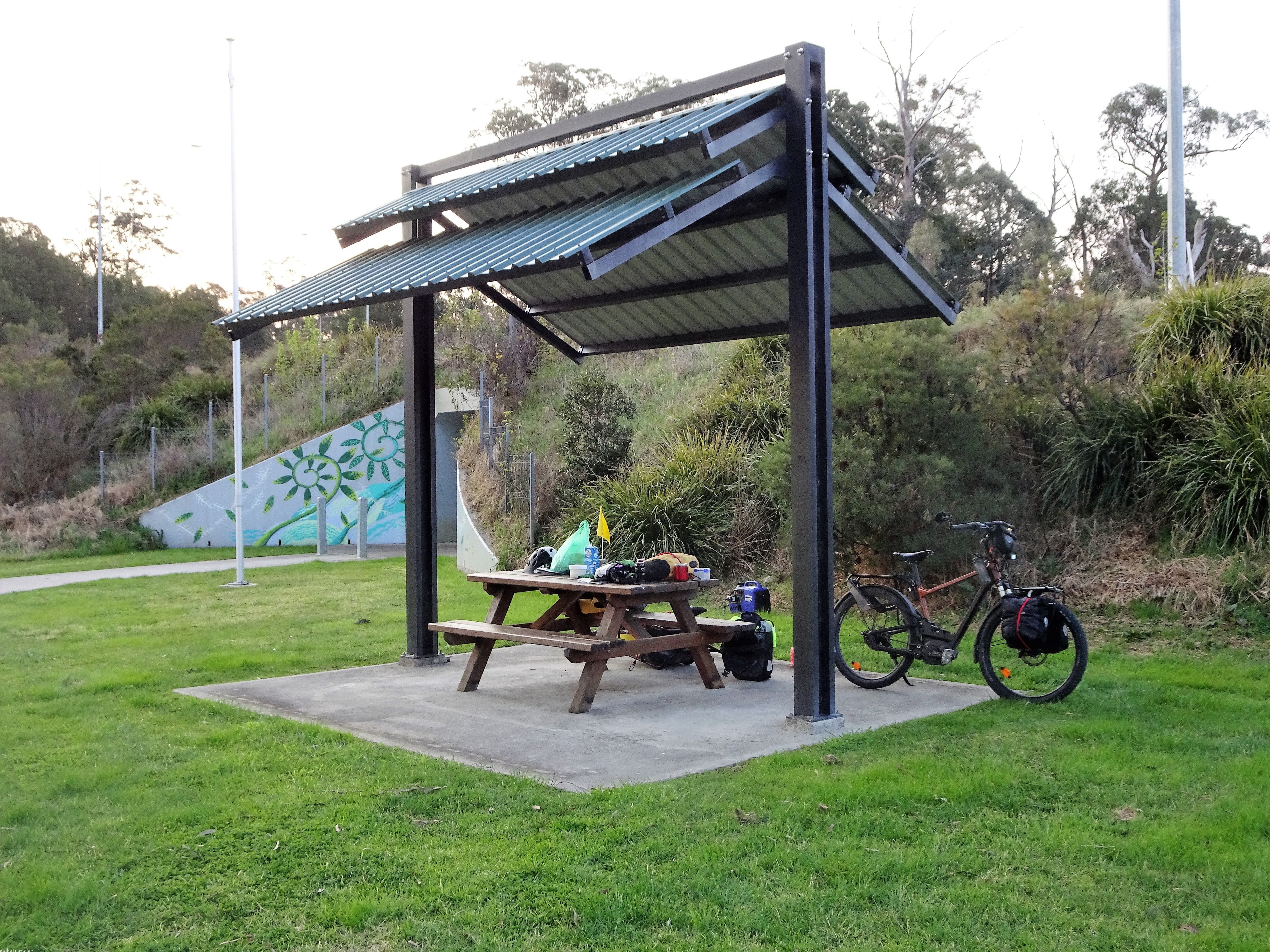 My average speed for the day was only about 17 kph because of the hills (the overall average so far is 22.6 kph, to put that into perspective), and I was very exhausted by the time I rumbled into Cann River to spend the night free camping down by the river.