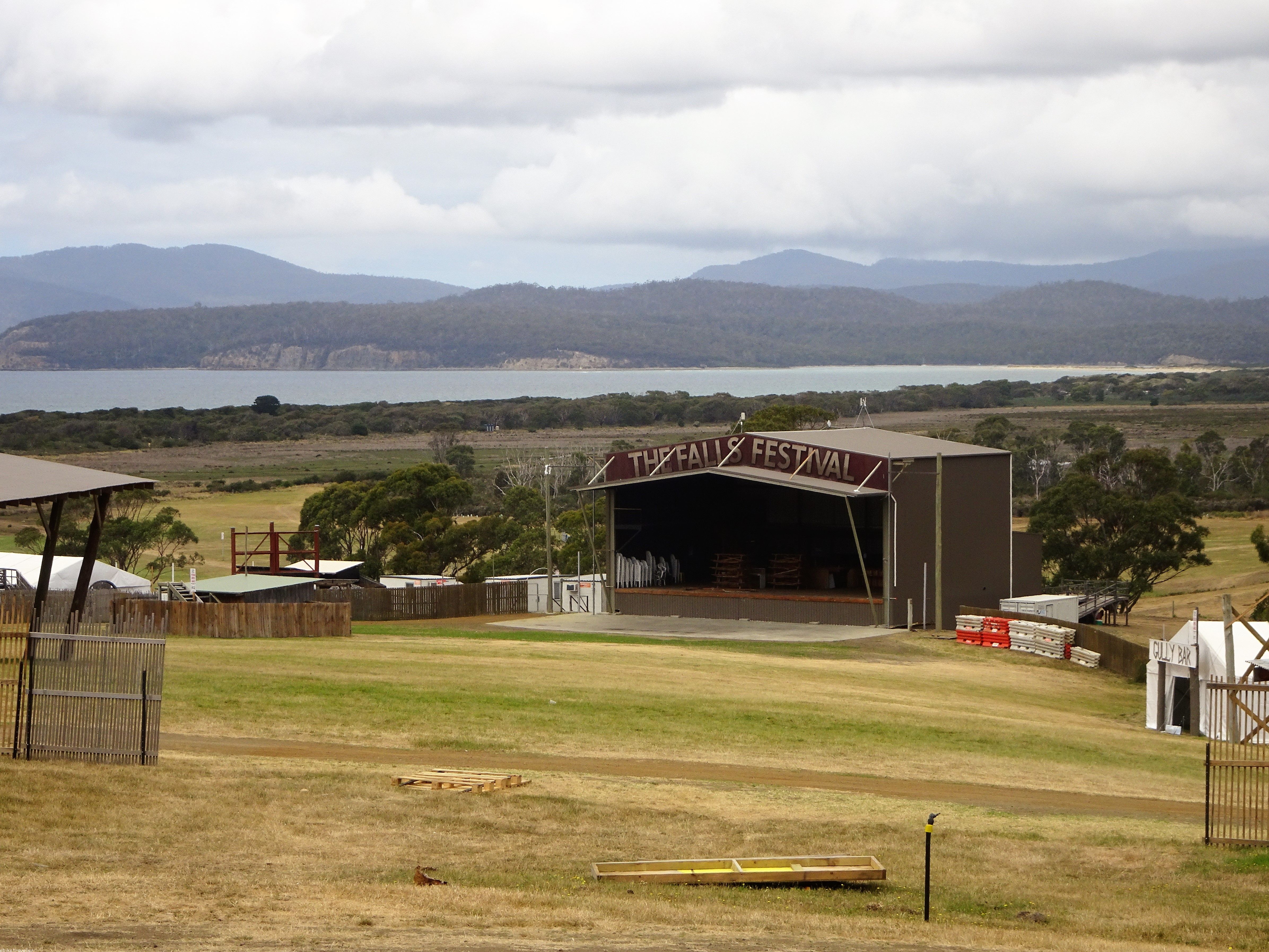 At this point, with this calamity going through my head, I met another pair of cycle tourists – Boris Botman, (like Batman, but with an “o” he said so I’d remember) a 23-y.o. student from Belgium, who I’d actually already briefly met getting off the ferry in Devonport 5 weeks ago, and his cycling companion, Mathieu, a 41-y.o. very funny Frenchman and veteran cycle tourist, with Sri Lanka, India, Korea, and most of the Americas and Europe already under his belt. I calmed down over a pint at the Spring Bay pub and made the decision to stay on in the free camping area behind the pub to allow my electrics to dry out before pushing my luck to see if they still worked, and went, in the rain, to set up the tent to get everything under cover. In the end the others decided to stay too, it being Mathieu’s birthday next day. Rob, a young English hiker we met in the pub, also joined us. Interesting, friendly folk one and all, and we had a bit of a session talking the joys and dramas of being on the road, sitting there on the damp ol’ ground.