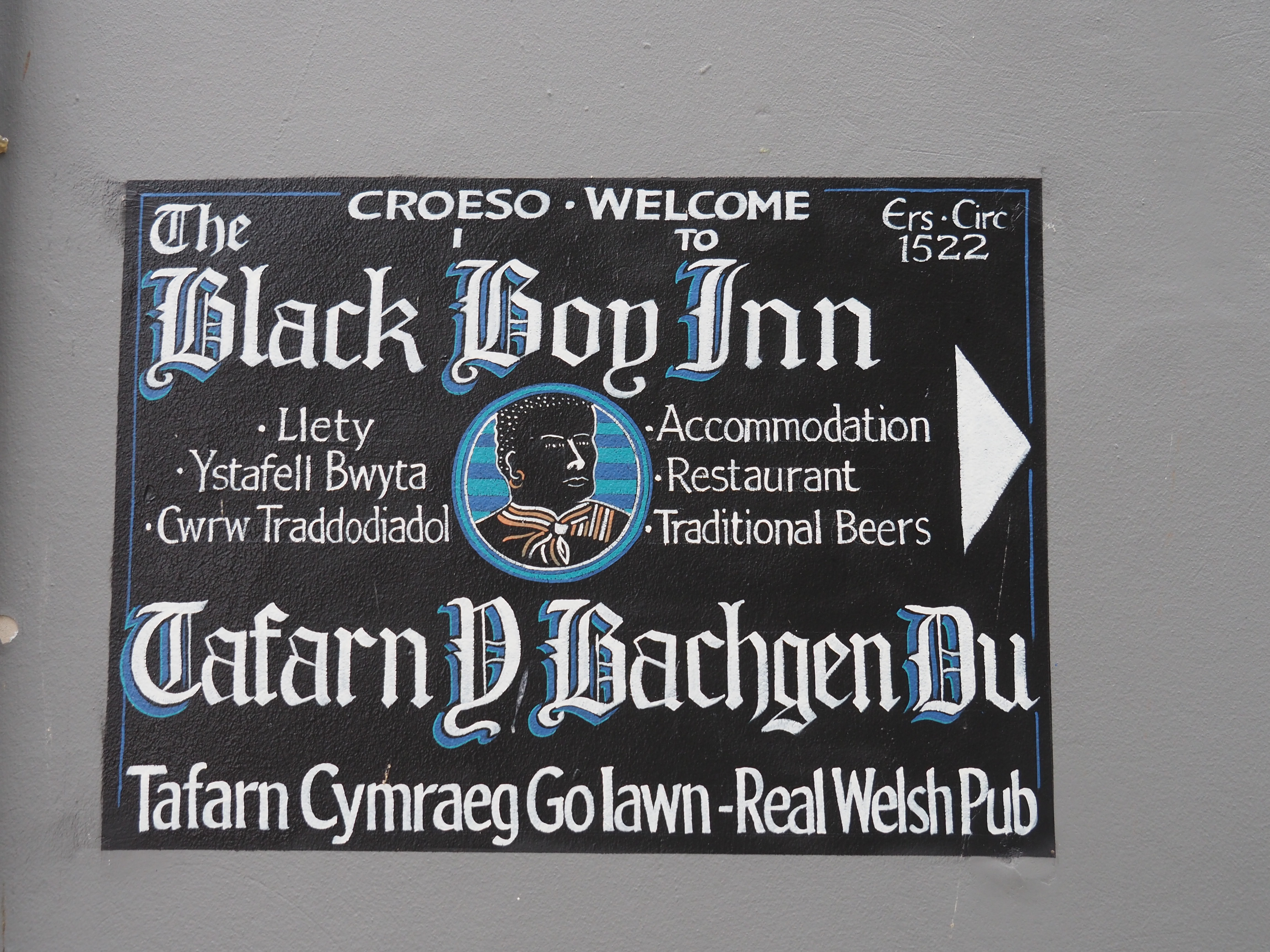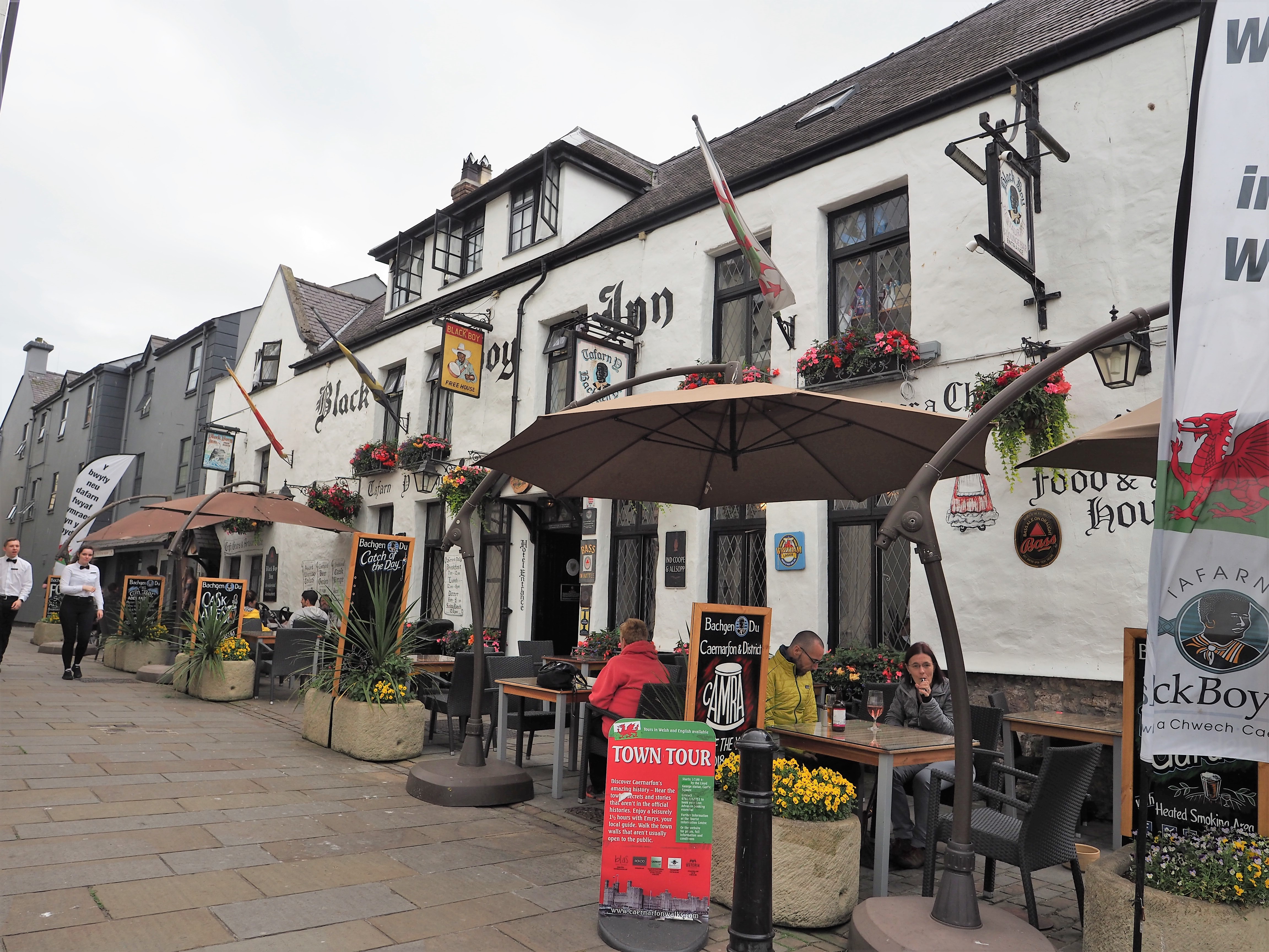 I’m glad I persevered and made it to Caernarfon, which is another one of those ‘feel-good’ places. I stay in a terrific hotel within the old city walls with the politically-incorrect name of Black Boy Inn. It is a large rambling complex dating from the 1530s and I count 9 separate narrow winding corridors (and 5 fire doors) between my room on the first floor and reception. Welsh is the spoken language around here between both the staff and the customers. At least I assume it is Welsh. What would I know.