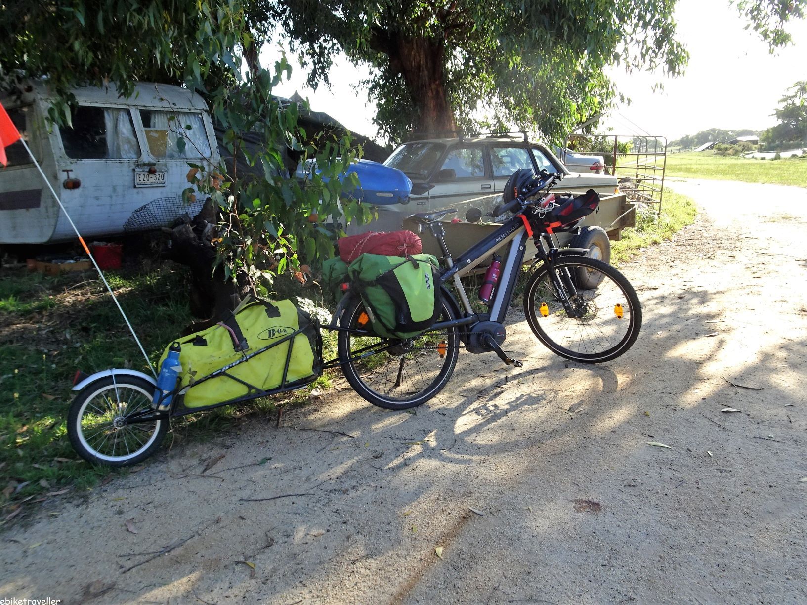 A large and profesionally-installed solar array supplies power for the fridge and the bike-charging power outlets. It is all owned by a lawyer from Melbourne, including a proper house in the paddock next door that I got a brief glimpse of through the trees (and hence the fancy solar array). Bruce is the live-in manager of it all, and his duties include looking after the few head of cattle as well as a “Camping with Koalas” business, and his ebike tours of course, that are just getting off the ground.