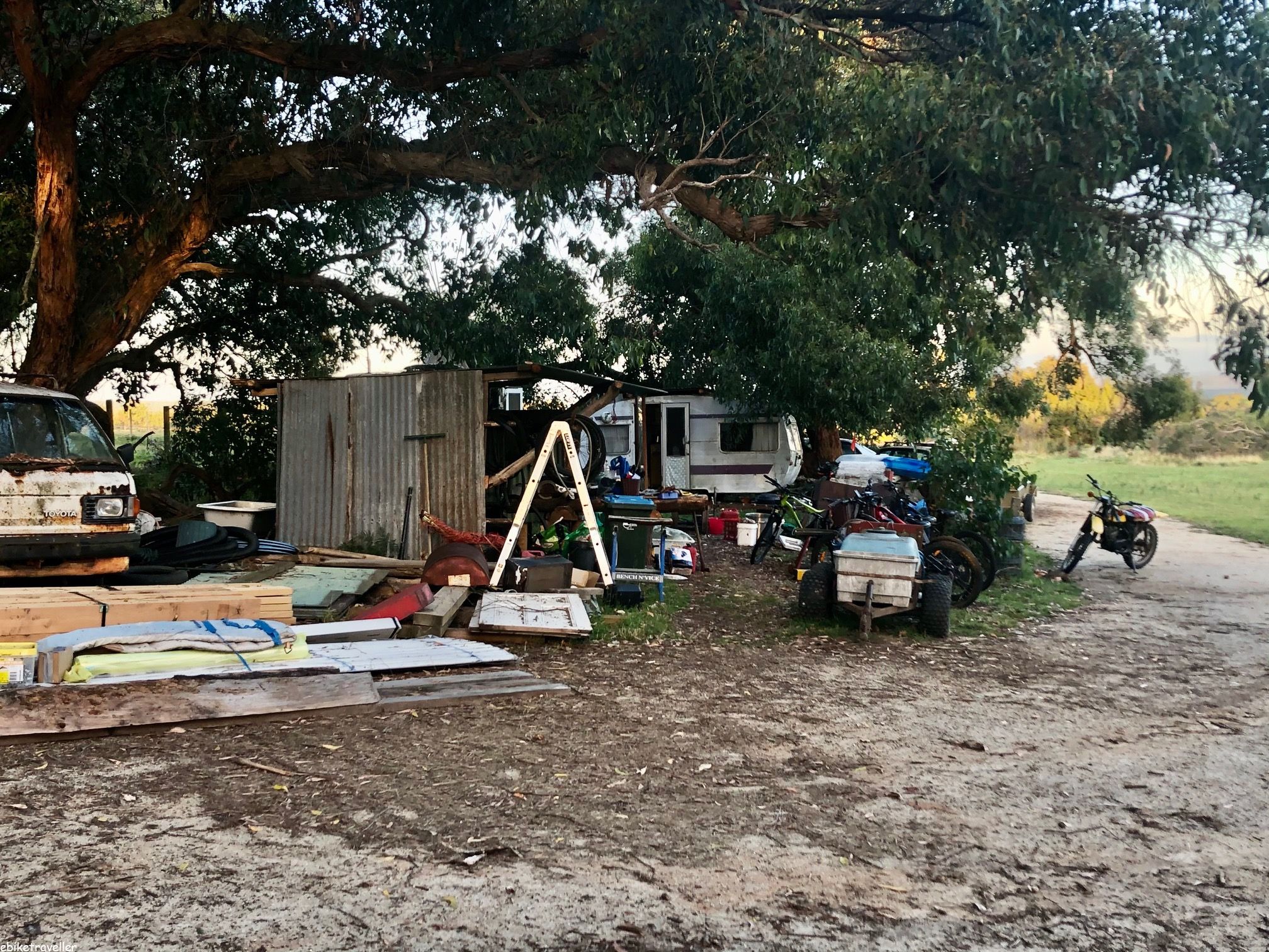 I wondered what I’d gotten myself in for when I arrived at Bruce’s place in mid-afternoon. Living arrangements are informal and rather rudimentary. Abandoned cars and machinery lay about. A small open-sided shed seems to be the main kitchen/ washroom, with a few stools and benches around a hearth outside as an eating area. Other open-sided sheds housed the ebikes and all their spares and charging apparatus. There were two teepees. Bruce lived in one and I think the other one had meat hanging up in it. It must be awful in winter when it’s cold, wet and muddy!