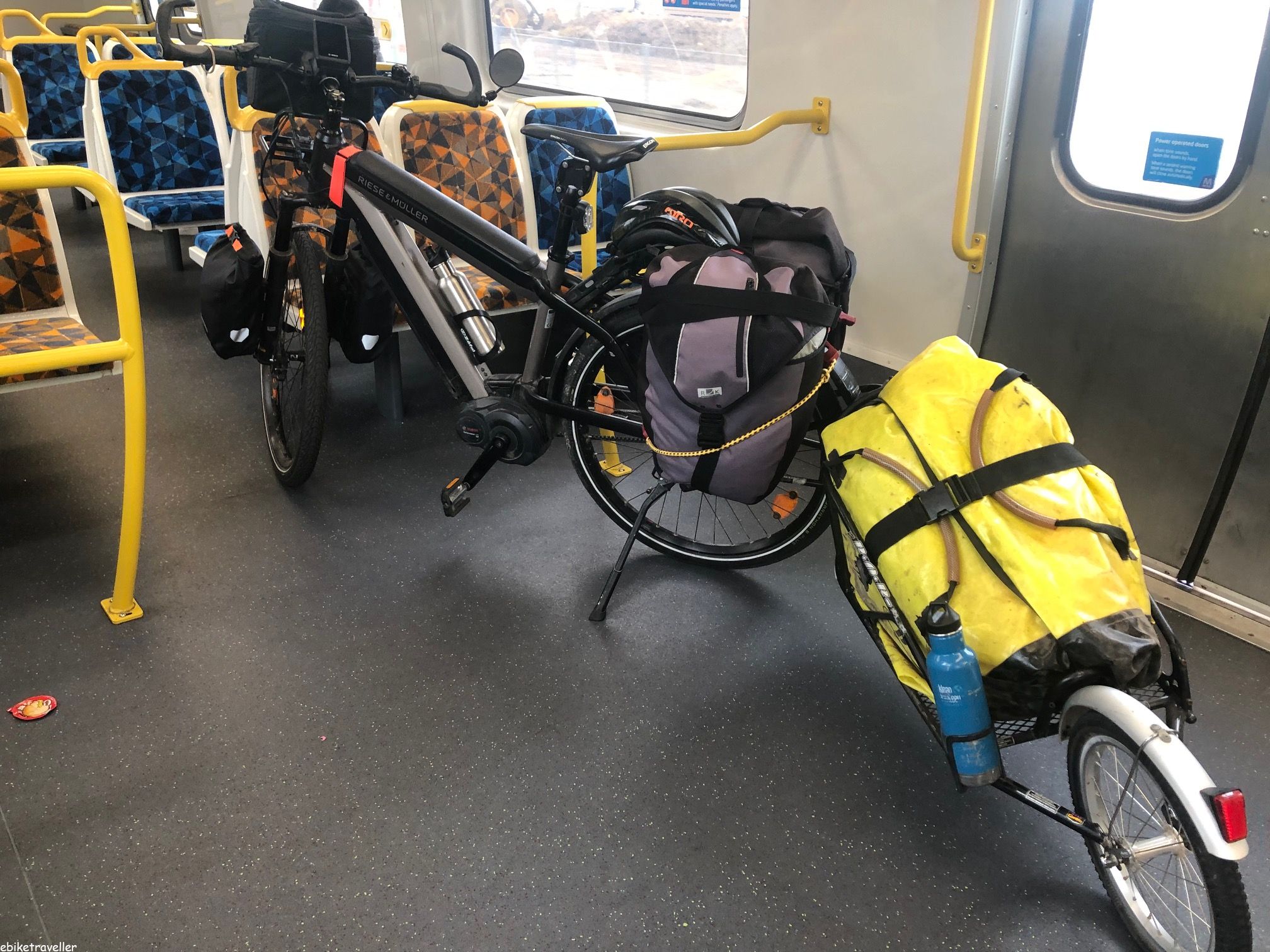 I was nervous about taking my eBike and trailer on the train. That’s because it blocks the aisle and obstructs the doors on one side of the carriage (and the doors open on different sides for different stations). My main concern was that a late-coming commuter dashing onto the train might trip over my trailer and break a leg. I was at the middle door of the first carriage, and this is the best spot because the first carriage is always less busy. It was the quiet time in the middle of the day anyway. I freaked out when a group of 8 disabled people and their carers came aboard but they congregated around the front at the door where where the train staff put the loading ramp so it was ok in the end. Still, a bit nerve-wracking and I remained stressed the whole time I was on the train.