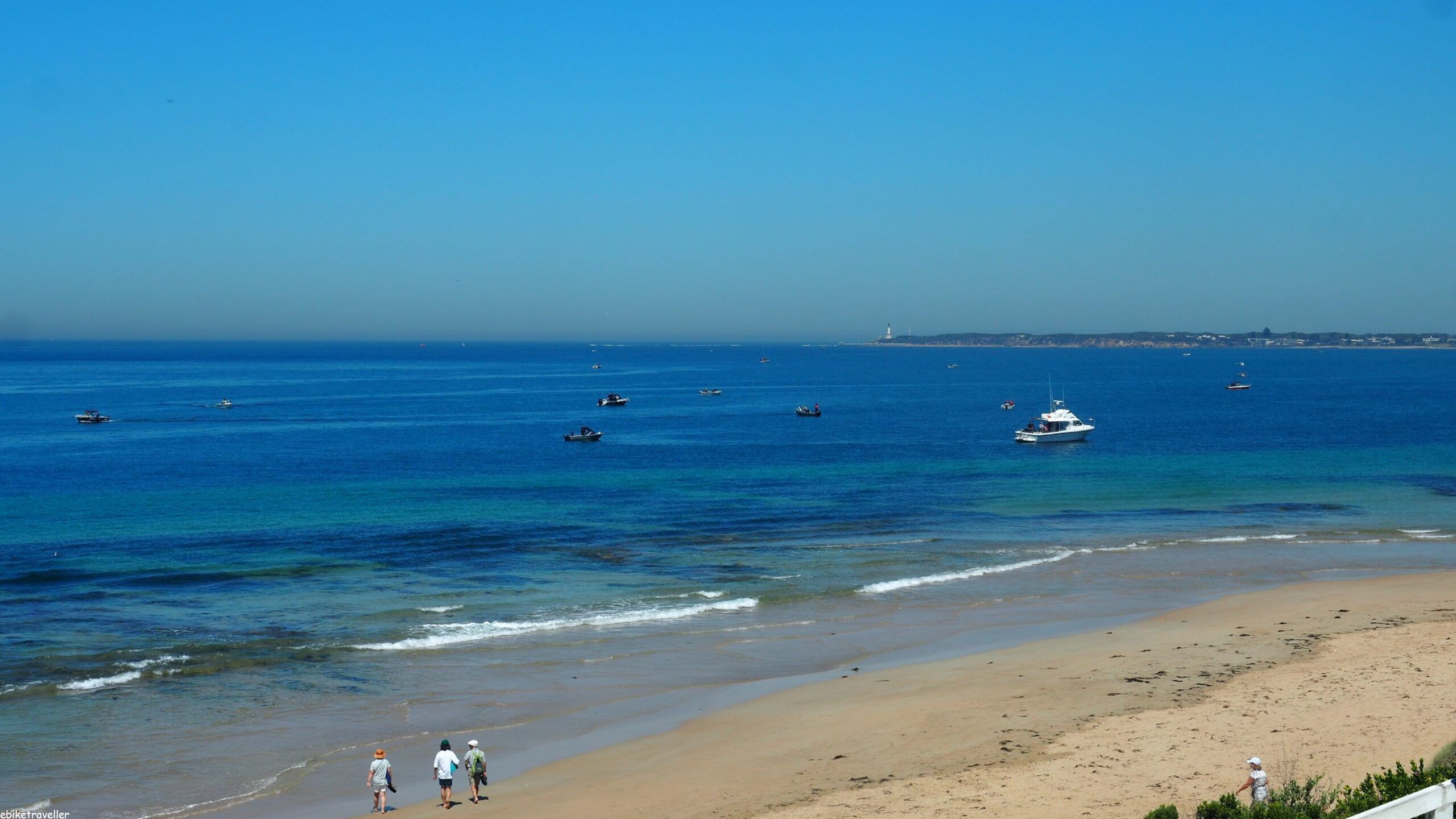 But eventually someone put me onto the ‘hiding-in-plain-sight’ caravan park of Queenscliff Recreation Park that I’d missed twice already, tucked-in, as it is, behind the non-descript Bowls Club and Sports Ground, but just across from the lighthouse that signals “The Rip” approach channel and entrance into Port Phillip Bay. And it was really very good, too. Highly recommended. The camp kitchen is superb (I was the only user, too), and the other facilities and proximity to the beach and to the town’s shopping precinct made it ideal for the travelling cyclist. I even went for a lazy swim in the protected natural pool at the beach just below the “White Lighthouse”, and watched the flotilla of small fishing boats drift-fishing as the rip ran out of the bay, and the frequent large cargo ships lining up and running into the bay.