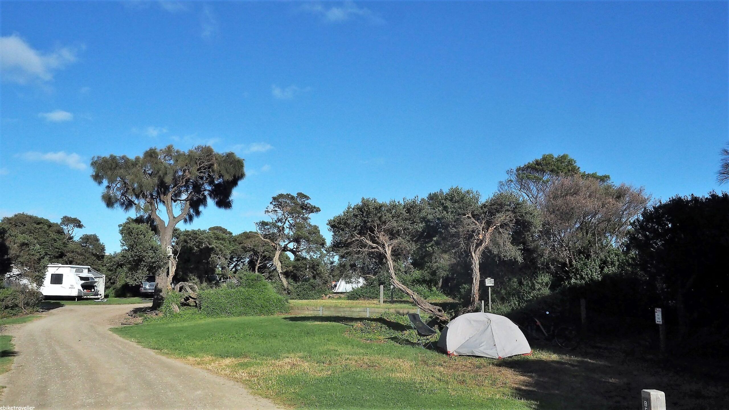 It seems Geelong showground is home for several troupes of travelling circuses – whether this is usually the case or just because of COVID I couldn’t say. The circus folk were all ensconced up one end of the showgrounds and us few travellers were put well away from them down the other end. We travellers consisted of half a dozen caravanners and campervanners plus me, the only cyclist (ok then, e-cyclist). None of them were all that friendly, though one of the neighbours did come over in the morning as I was packing up to deliver a lengthy dissertation on the government and its handling of the coronavirus, and protesters, anti-vaxxers etc. I listened politely and made a few neutral comments so as to avoid inciting him should my perceived views differ from his. He seemed to hold some anti-aboriginal sentiment that I was not keen to explore, but anyway he eventually did leave me alone without provoking an argument.