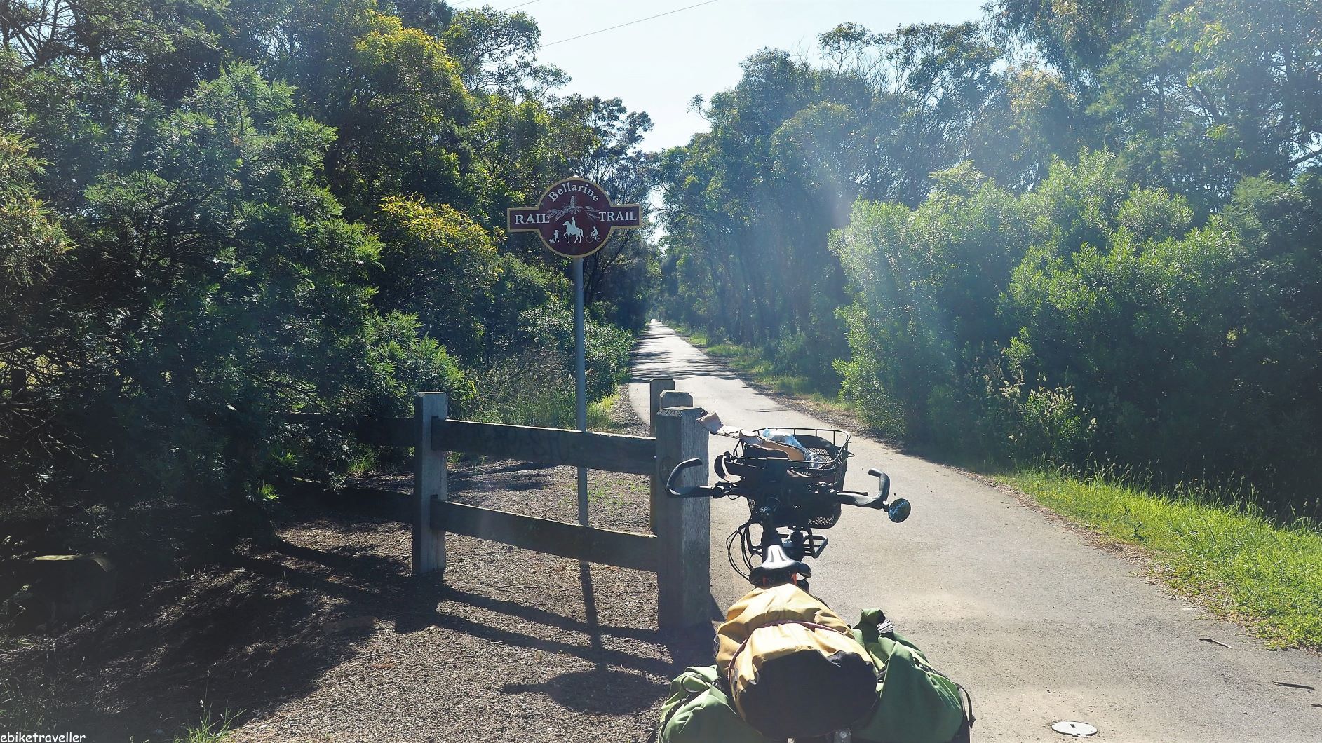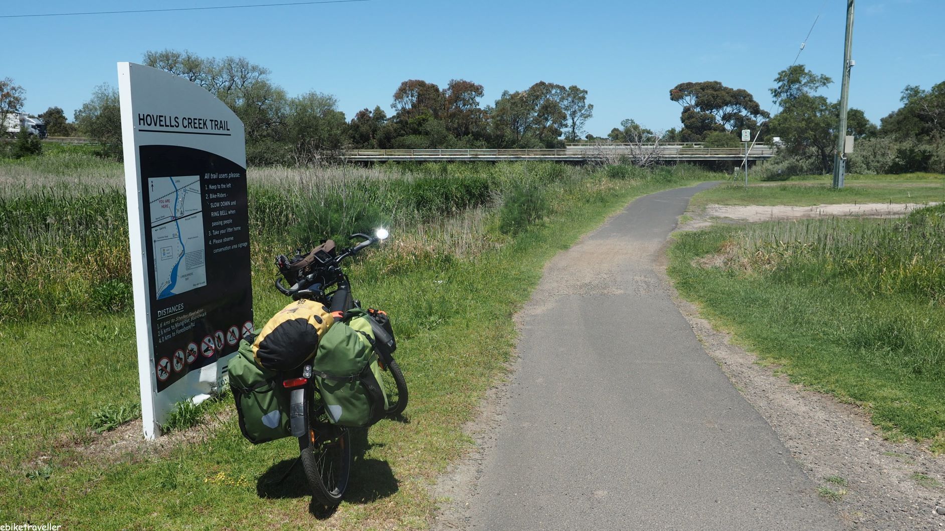 I wasn’t in any particular hurry, but still got away early from the Geelong showgrounds – it’s amazing how galloping horses and a belligerent neighbour can get you up and hurry you along. So, as soon as the sun was high enough to dry off the tent from the heavy overnight dew, I was packed up and away at 8.30. The Bellarine Rail Trail is easy to find and easy to follow. In fact, it runs right past the showgrounds on the northern side (Carr Street, C112).