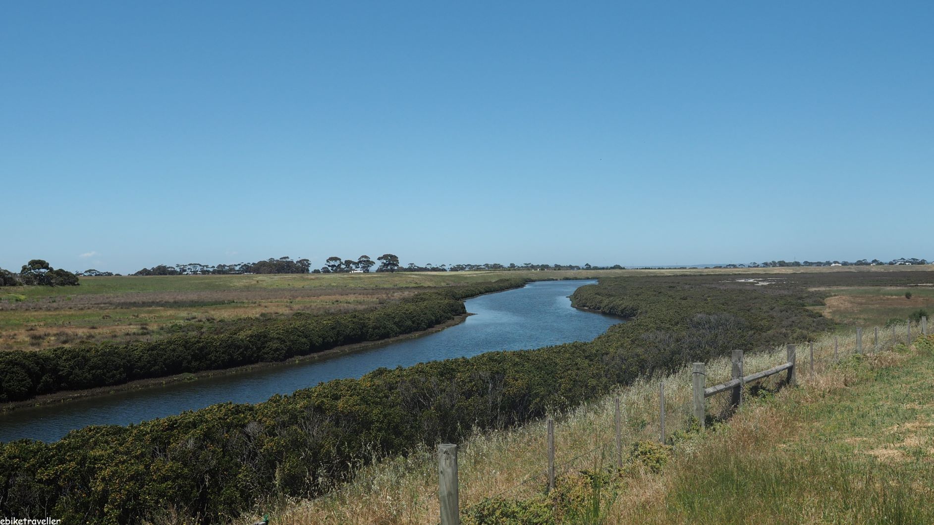 [Hotter today – high 20s. No wind at all until the last 5 km into Queenscliff. No clouds; plenty of sunscreen, long trousers and long sleeves were the order of the day. Road surface was about 40% compacted gravel and the rest bitumen].