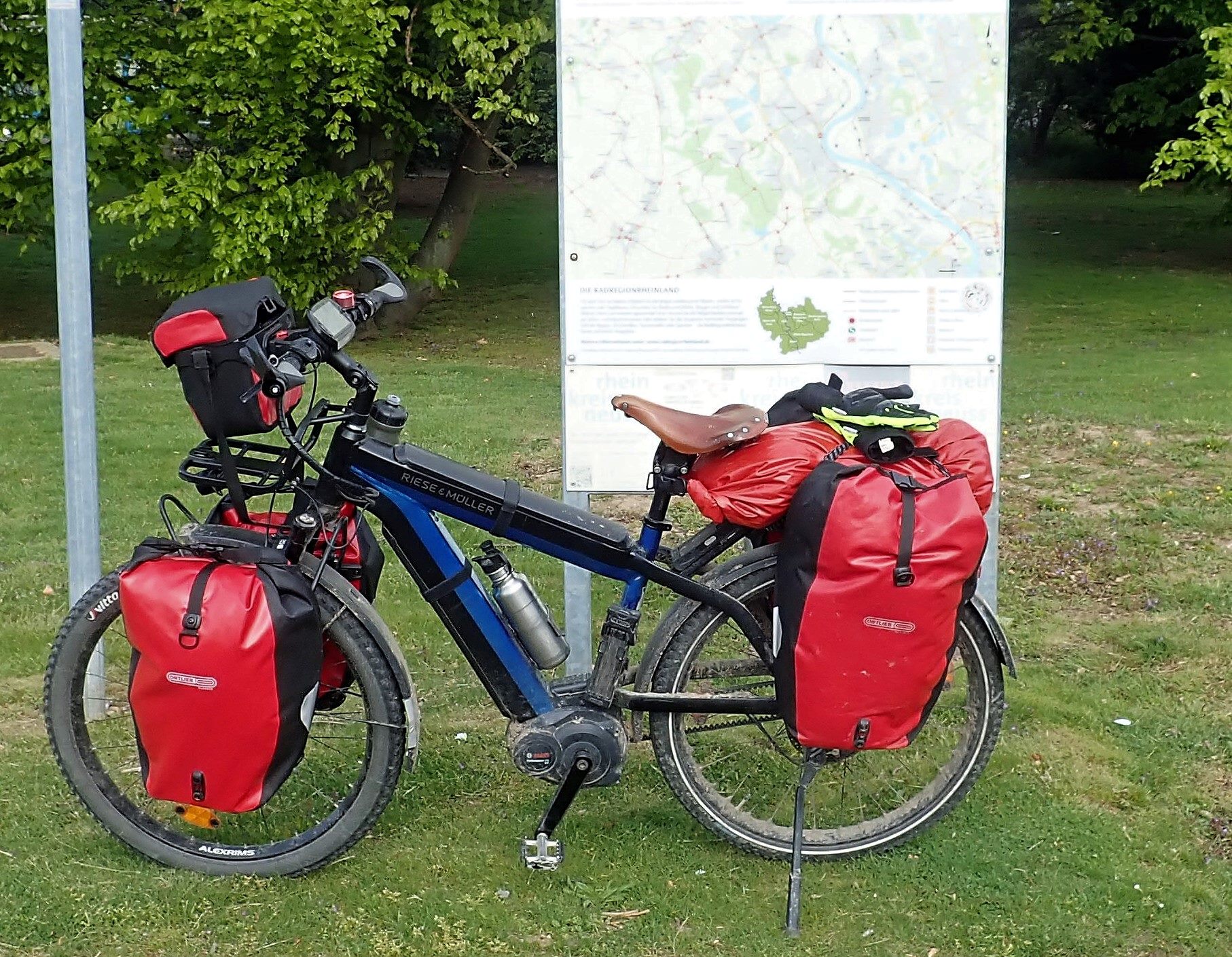 My two black front pannier bags had holes worn through in several places and weren’t watertight anymore. They were too small anyway, so I decided to replace them in Koblenz at the same bicycle shop where I bought them 5 years ago. I spent some time searching (zoom in on the GPS track at Koblenz) but couldn’t for the life of me find that shop, but never mind, I did find a huge ‘Fahrad Franz’ store (it even has an indoor test track!) and bought a nice pair of stylish red Ortlieb Front Rollers for €140.