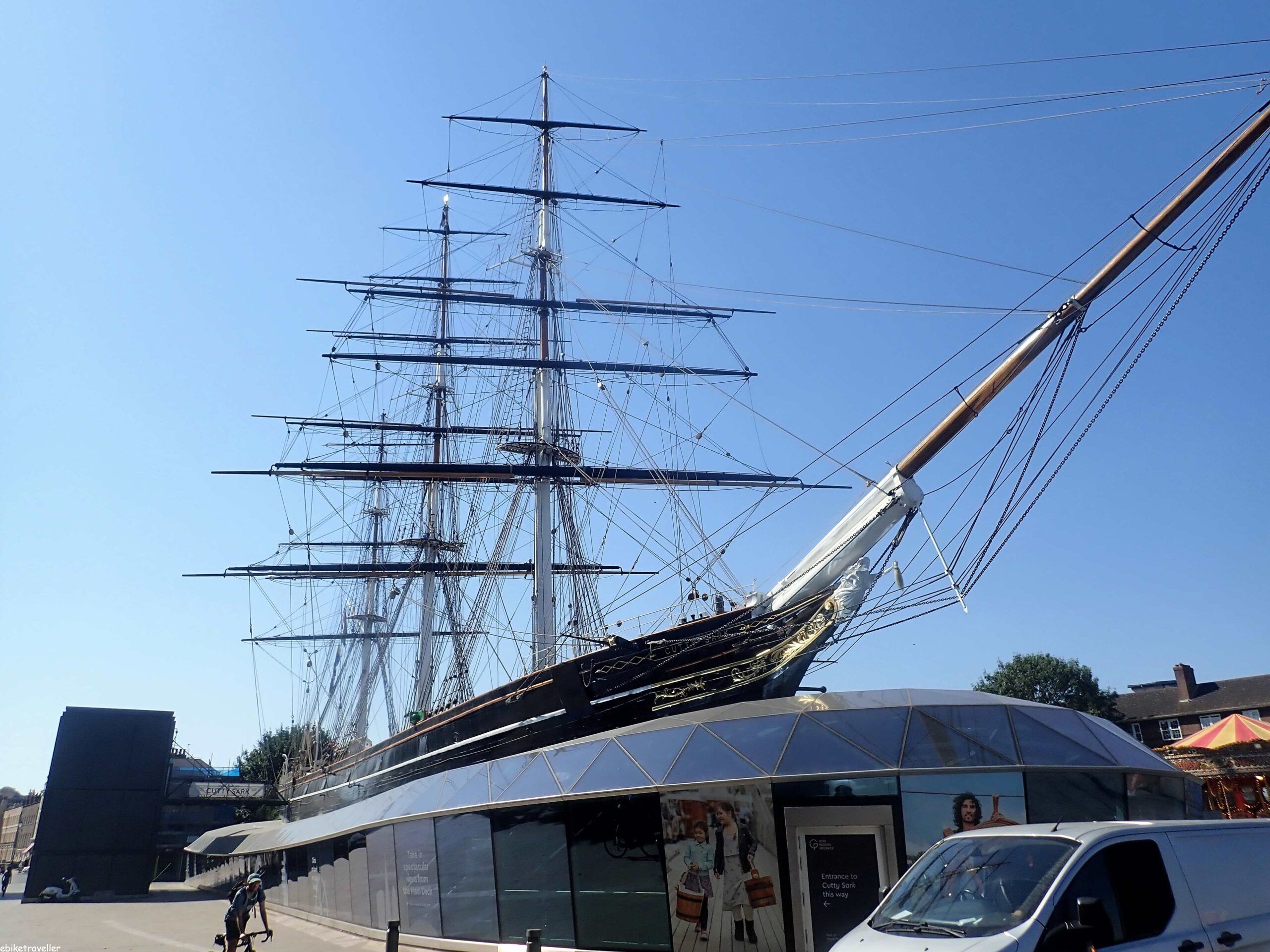 I really like cycling around London. The new cycleways are amazing. National Cycle Route No.3 to Dover officially begins at Greenwich and my Bosch GPS delivered me there from Wanstead perfectly, including through the under-Thames bike tunnel that emerges at the exhibit of the Cutty Sark sailing ship.