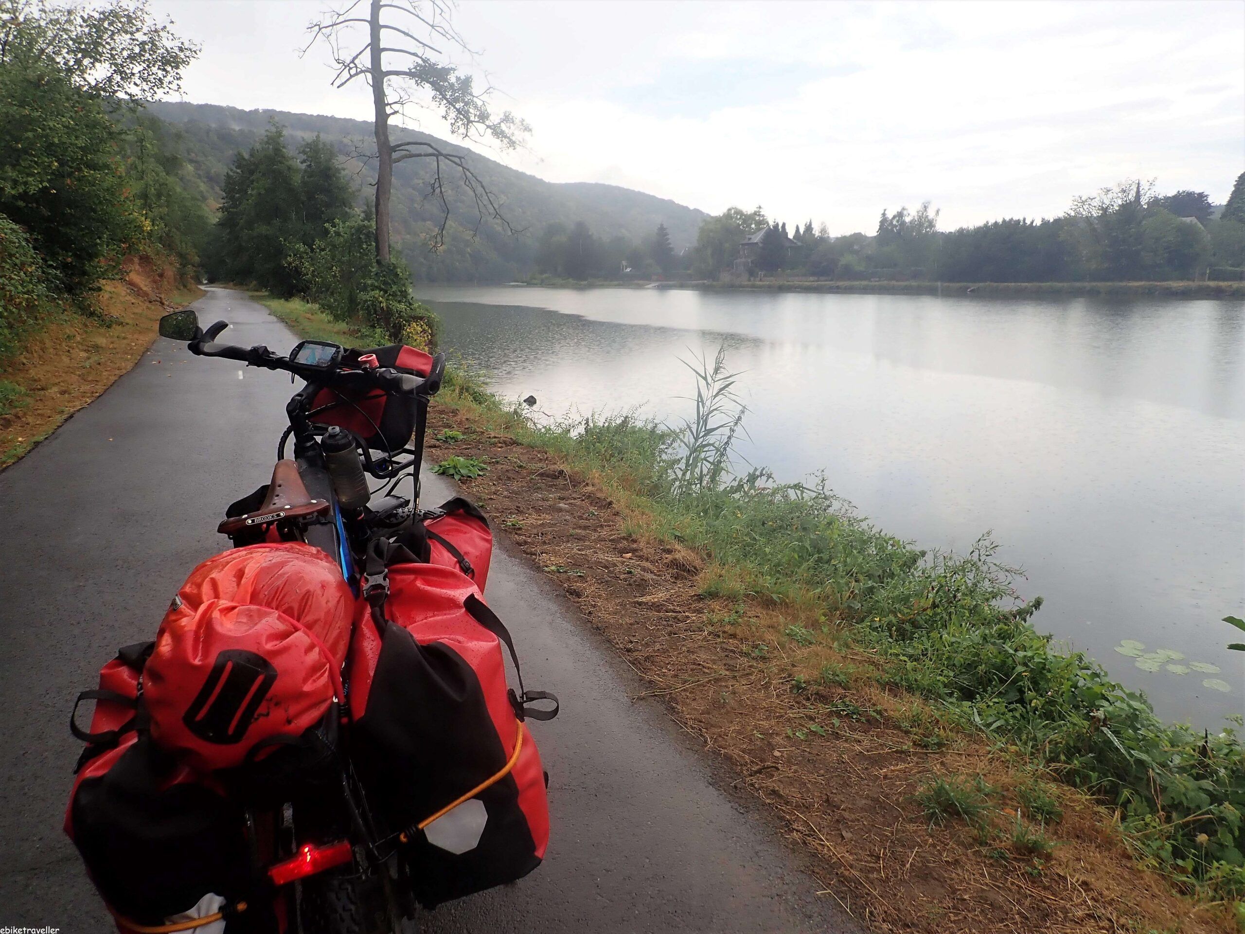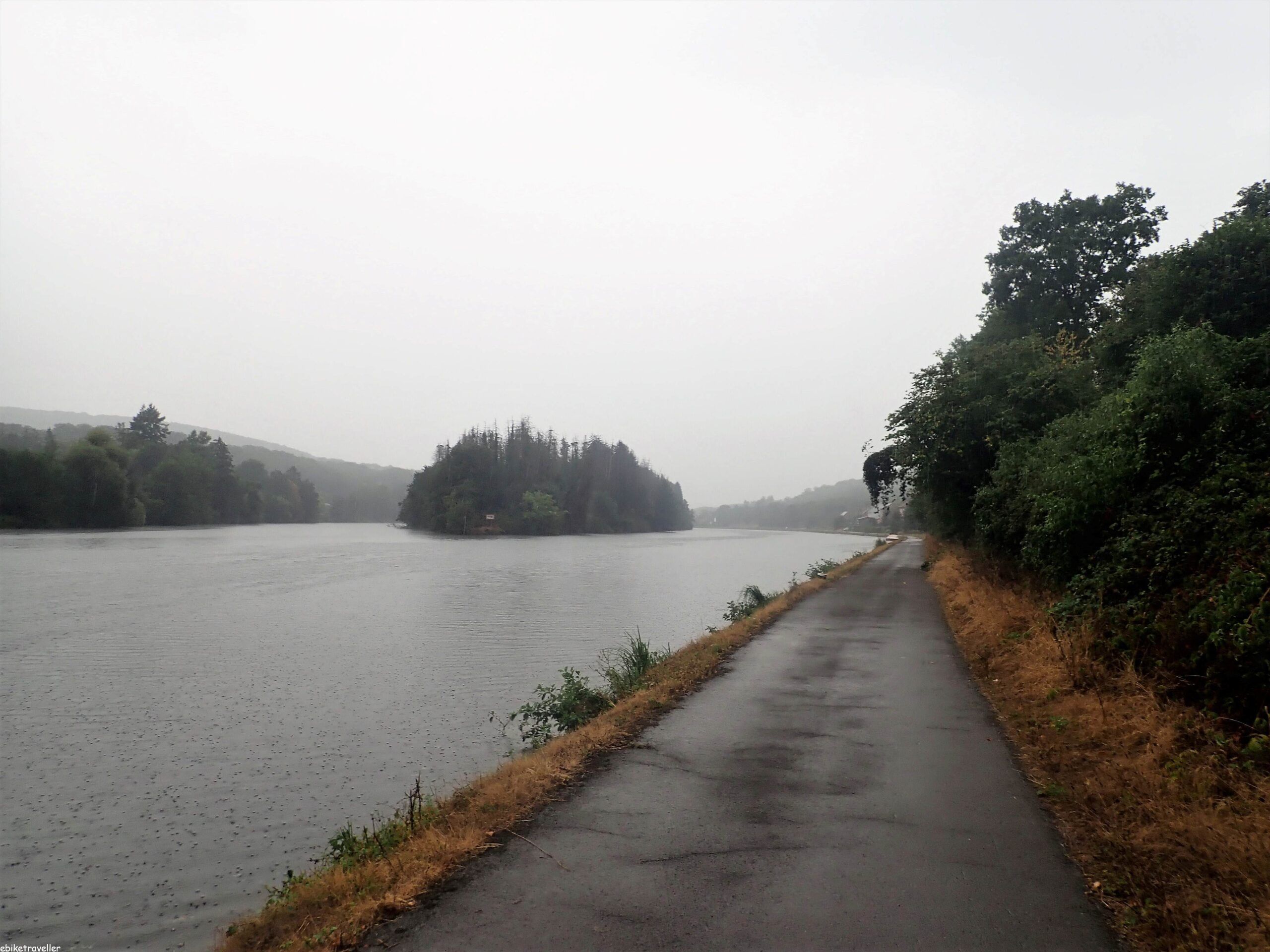 I packed away my wet tent and headed out at 10.00 am after waiting for another storm to pass. Light rain persisted throughout the rest of the morning but the cycling, along the left (west) bank of the river on the well-marked trail, was really great and so the rain didn’t matter. Plus, I had all the right wet-weather gear!