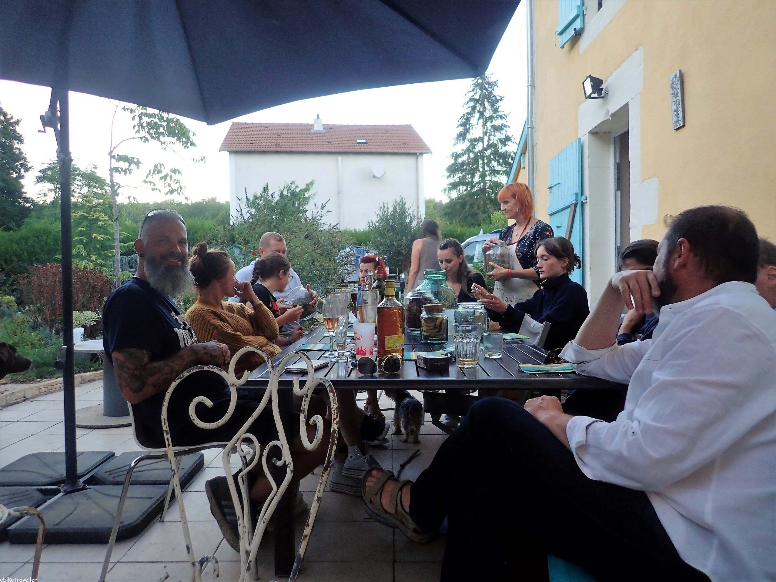 There was a lot of mandolin, guitar and squeeze-box playing and karaoke – it was all good, old fashioned home-spun family fun – kept going with a never-ending supply of traditional french-style pizzas, (flammekueche française) and beer laced with orange liqueur that is called Picon. Isobelle’s 76-year old mother, Jaqueline, joined in and was a real hoot! They had a songbook (in French) and I had no excuse not to sing duets with one particular very sozzled lady.
