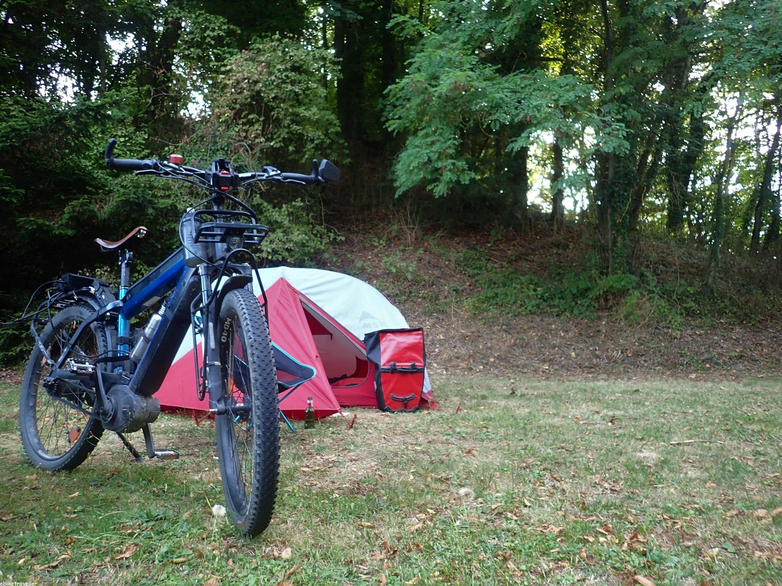 But getting there was funny – I was just about to give up and head directly to the small village of Toul instead, when a grown man appeared out of nowhere riding a tiny kid’s bike with flat tyres in bare feet. He tried pantomiming how to get to the location of the campground (Mandres-aux-Quatre-Tours, it’s called) but that was all too complicated so in the end he indicated for me to follow him, which I did, and at quite a dawdling pace. And just as well too, because the maze of overgrown tracks running off in all directions would have had me lost overnight, I reckon. It was already getting dark by the time we arrived. On the map these tracks showed as normal through-roads all linking up but in reality, most of them were narrow overgrown paths that finished in dead ends with a barrier of heaped dirt blocking them off.
