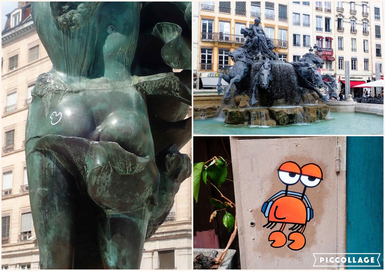 In general, I found Lyon’s architecture too grandiose and baroque, and the statues too baroque and grotesque to include an over-abundance of pictures of the city in my blog. My tastes in tourism run more to the quirky or human-side of things, if you know what I mean. A few examples follow: Duck-on-bum = Quirky (even though statue grotesque); tits-and-horses-imagery of justifiable war = Grotesque; Cartoon = Quirky.