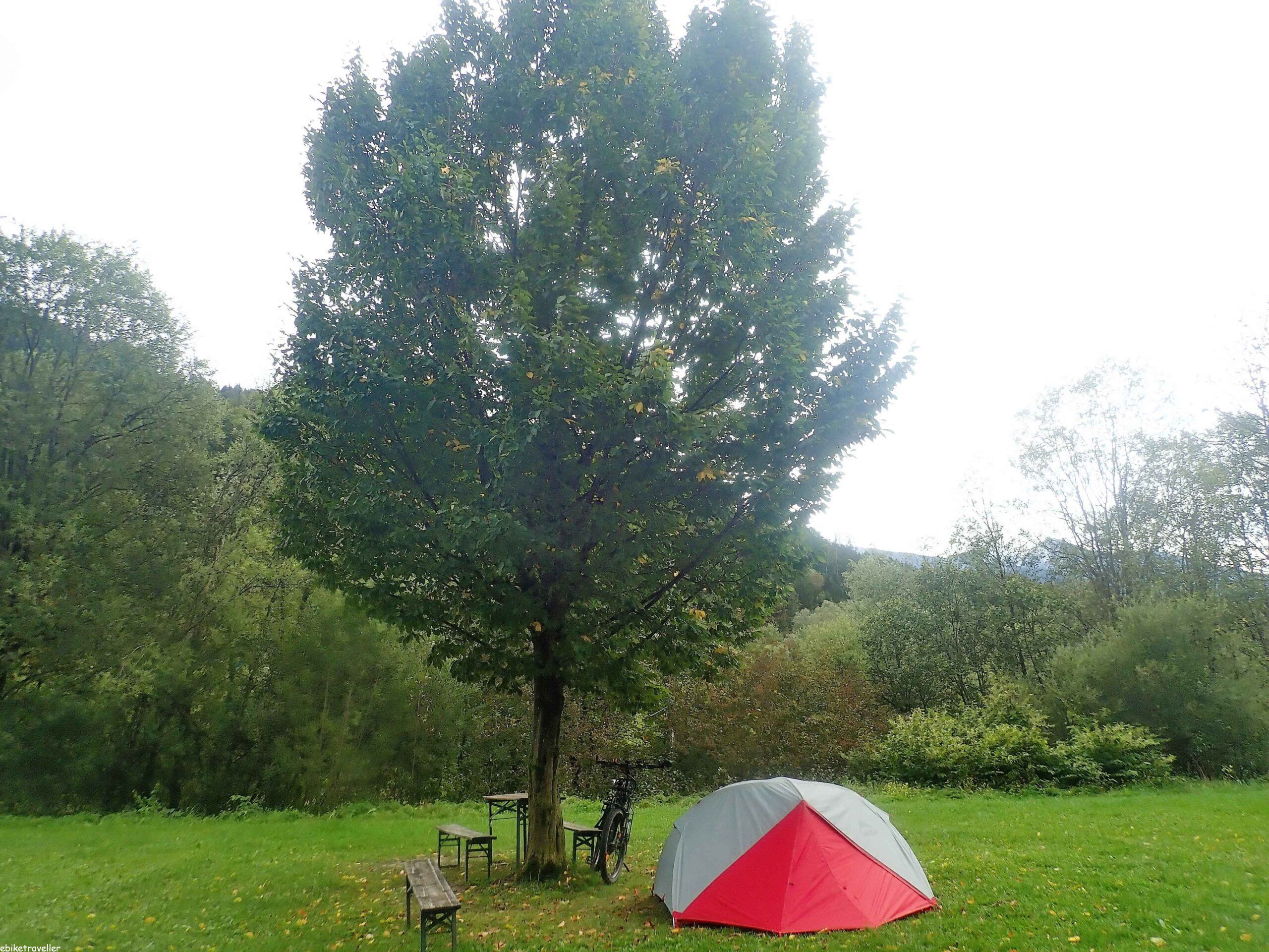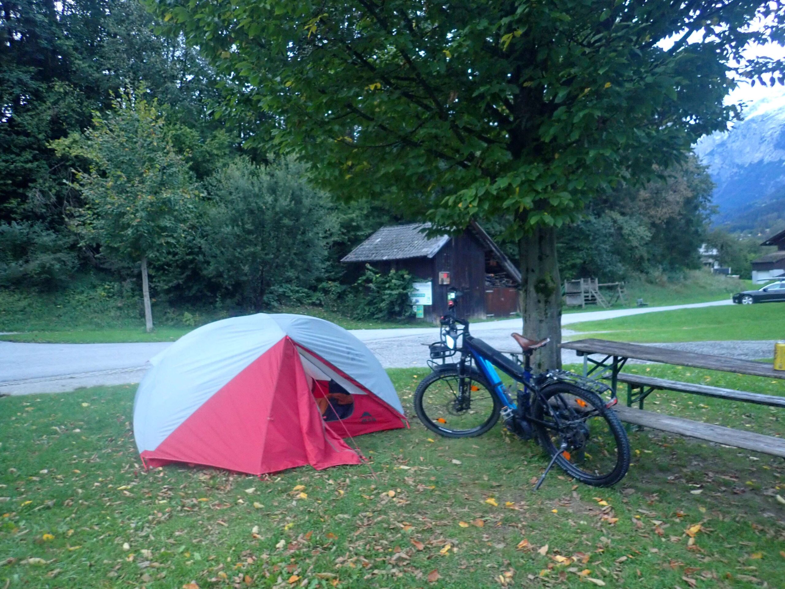 Schwanenplatz campground was still doing a roaring trade for so late in the season (I’d tried another two before theirs, and they were both closed), and it was virually full except for a couple of vacant tent pitches. Even my pitch was a bit of an afterthought, and was mostly just a huge tree jammed-into a lane-intersection – it took me ages and a trip back to the office to find it. They have a really nice restaurant built out over the lake and I had some nice home-style Austrian food to warm my belly – a pork knuckley kind of thing it was, with all the trimmings.