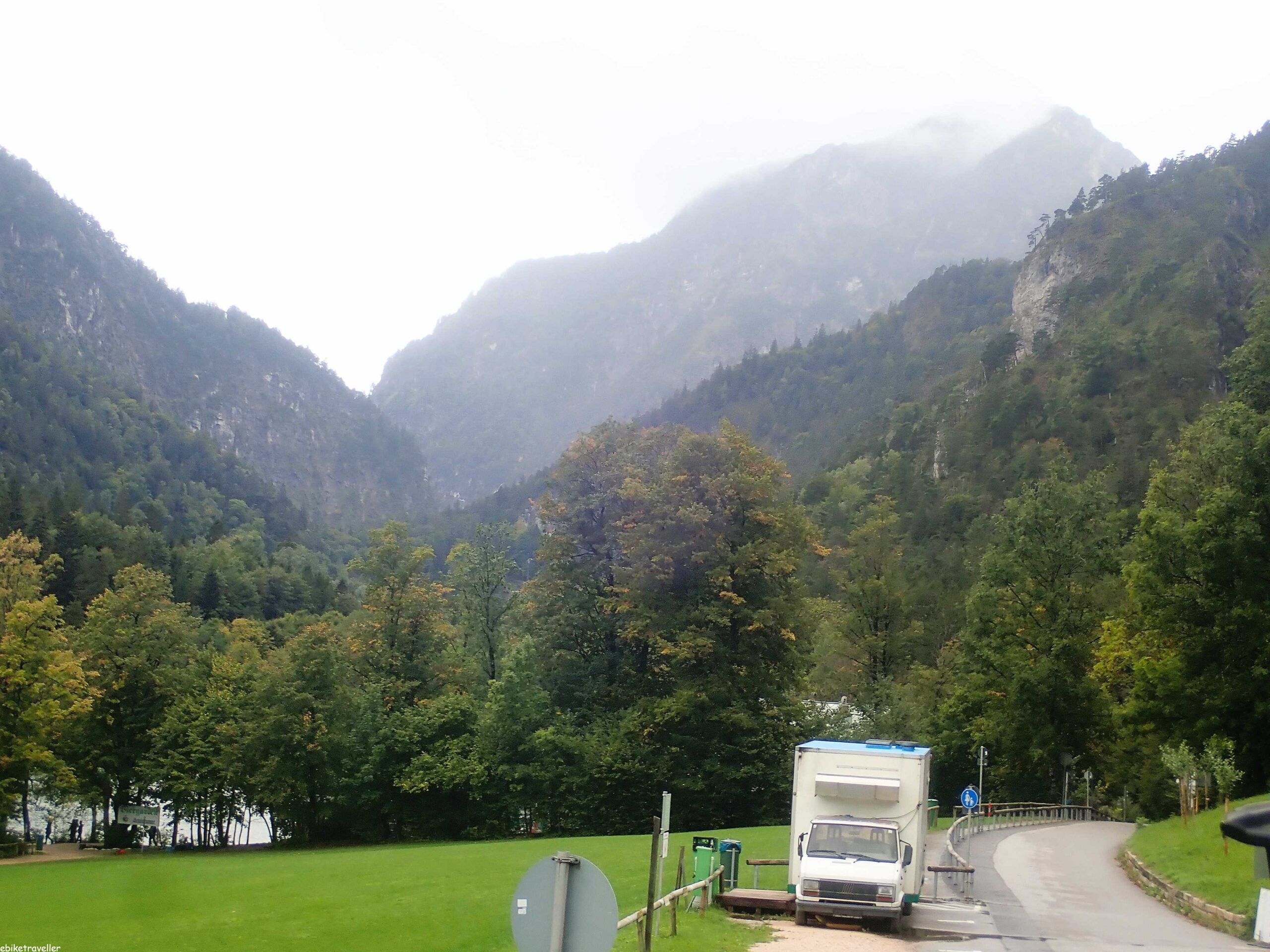 It was already 2 pm and there wasn’t much range left showing on the batteries so I pulled in to a swanky guesthouse/ restaurant called Alpengasthof Madlbauer on the edge of tiny lake Thumsee. There, I had lamb chops and a Radler beer for €25 while keeping out of the weather and waiting to charge back up to 4 cells (80%). It was nice and cosy inside their restaurant and bitterly cold and windy with intermittent rain out of it, so getting back on that bike was damn hard – and yet a bunch of hardy German highschool kids were swimming out to a pontoon in the lake and clowning about with hardly any clothing on, as teenage boys trying to impress teenage girls do.