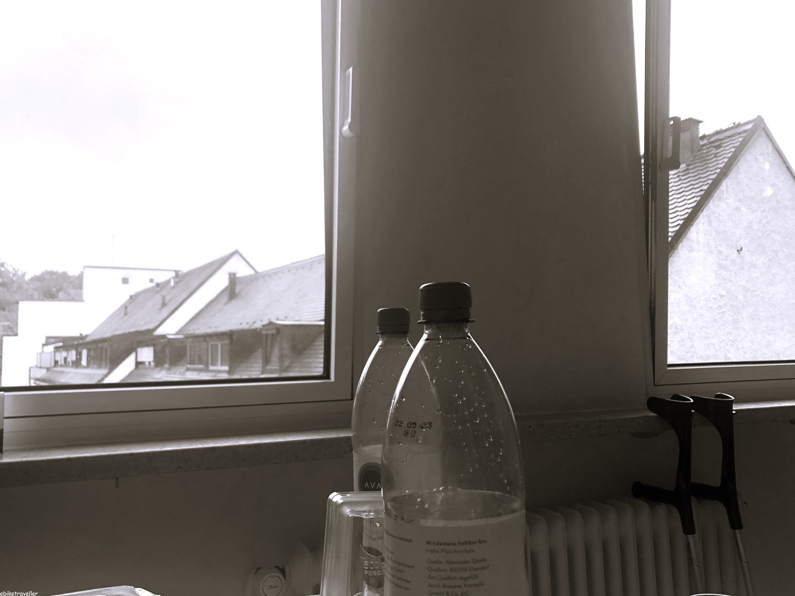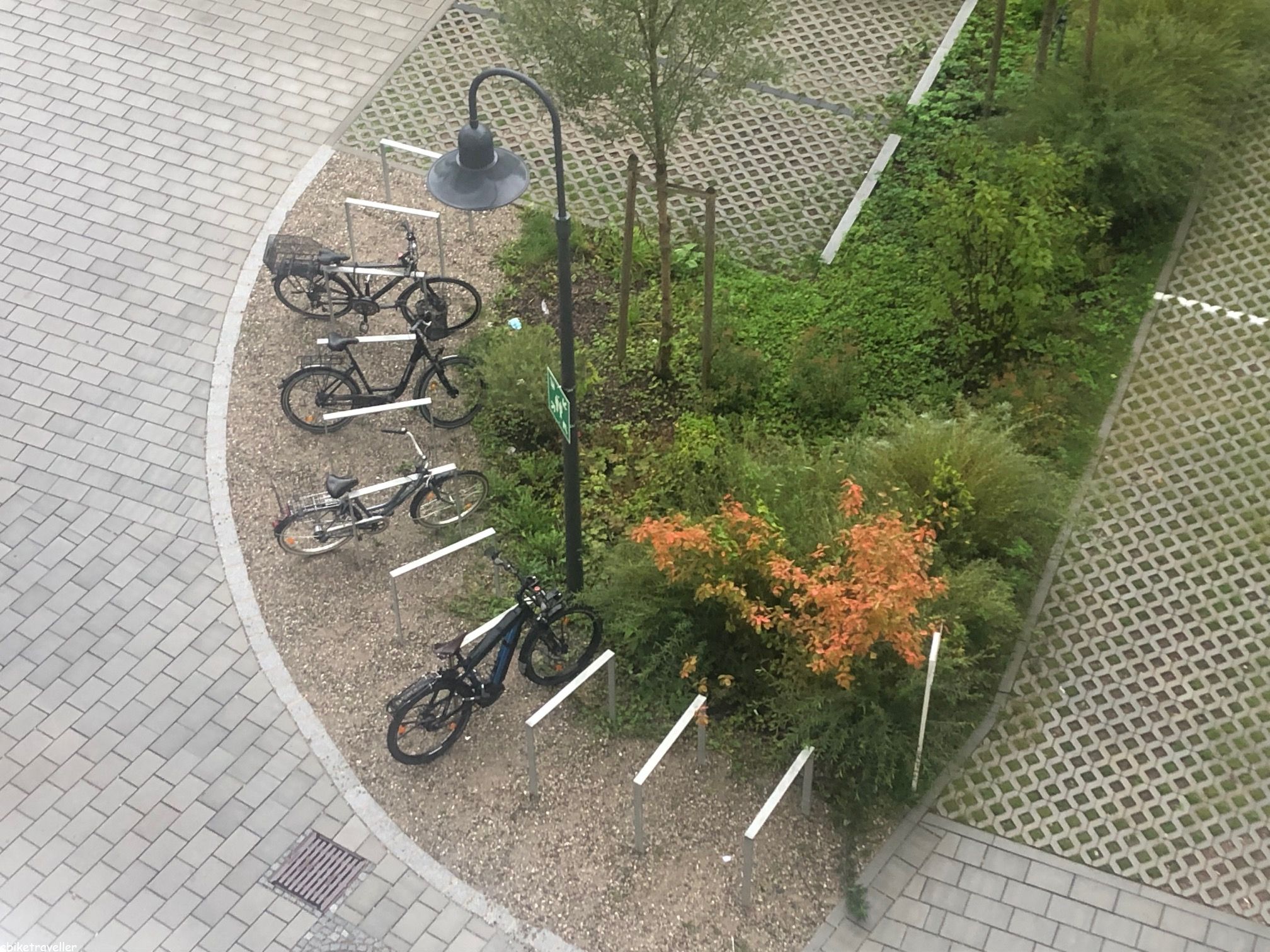 …until I could hobble over to the window and gaze down at my sturdy steed Ziggy – that’s him next to the street light – who someone from the Weis’n Camp had very kindly delivered, together with all my stuff, over to the hospital.