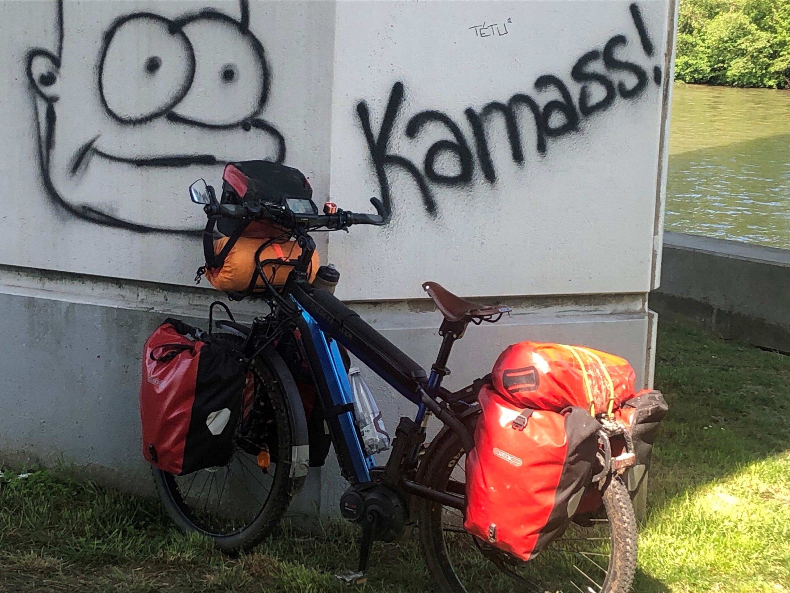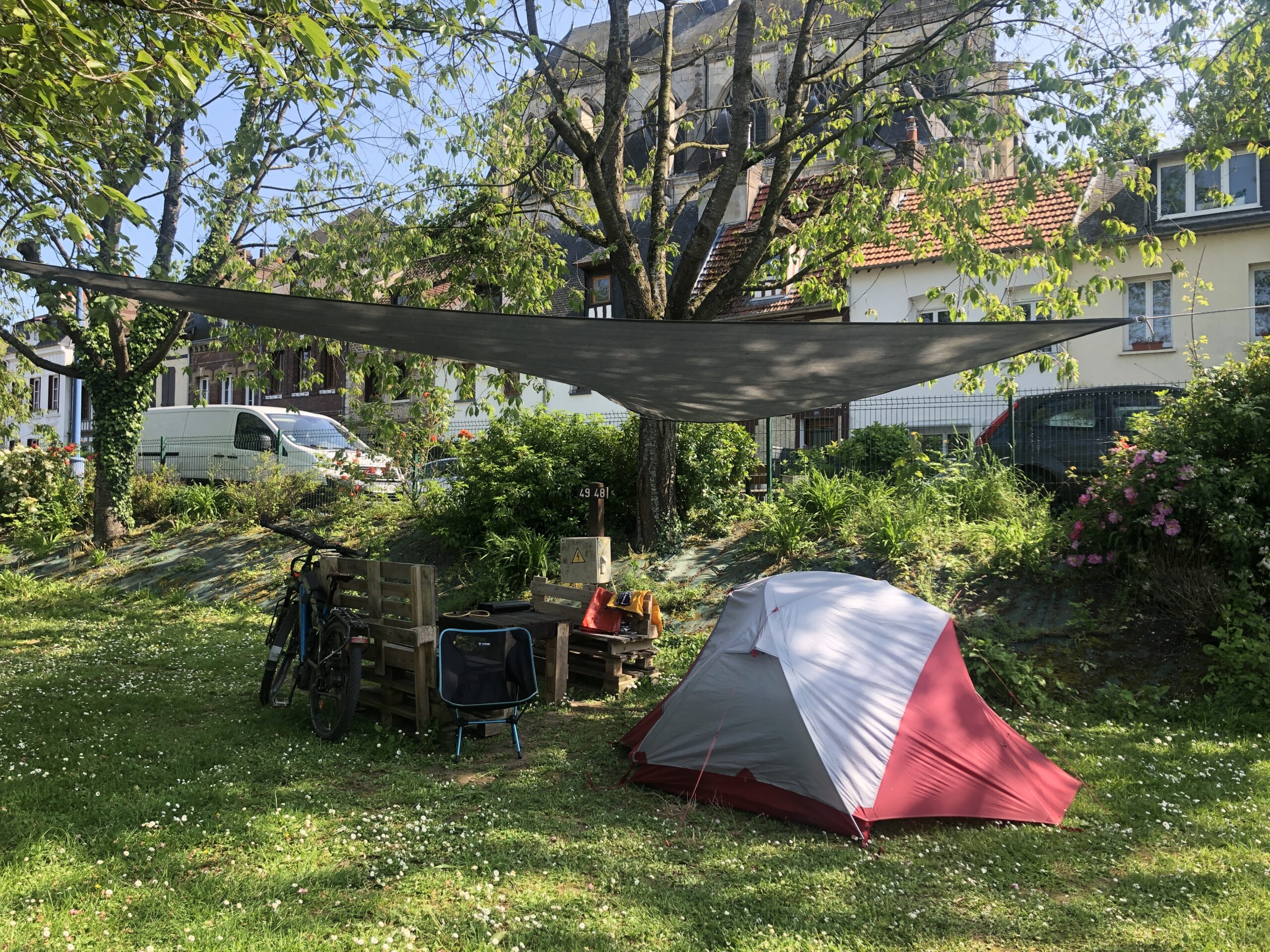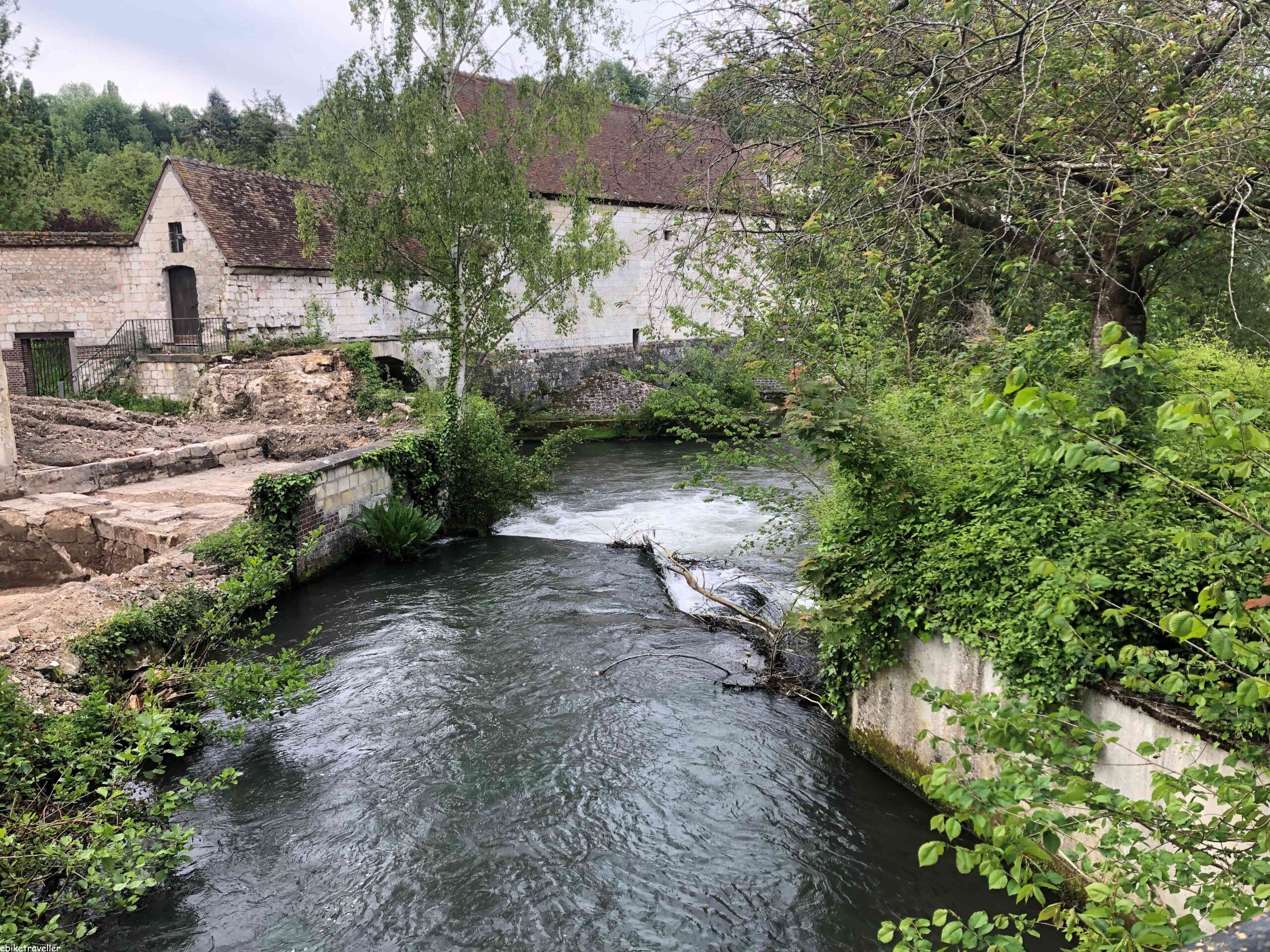 I could have gone much further for the day, the going was so easy and interesting, but the town of Pont de l’Arche drew me in and I decided to stop there because of the great little municipal campground called Camp Eure alongside the River Eure and right in the middle of town. The caretaker, Stefan, was really helpful and friendly and only charged me €5 (yes, that’s right – five euro!) for a really great pitch with a picnic table and shade cover, and he helped me with some tools to look at the kickstand problem and even loaned me a pressure-hose kit to wash down the bike.
