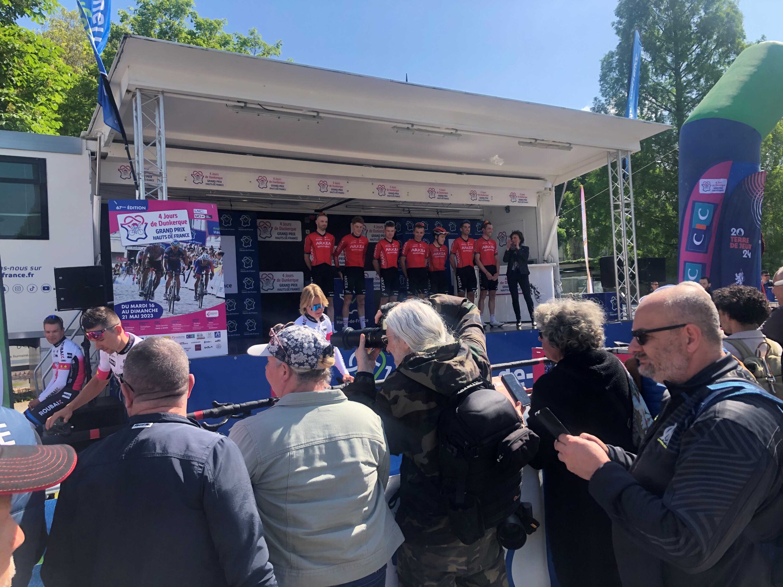 There was a big crowd in Compiègne waiting for the start of a stage of the “4-days of Dunkeque” cycling race, and I squeezed through just as the teams were being presented on the podium. I never realised what such a huge production these classic bike races entail, even this relatively obscure one: besides the crowd there was a huge convoy of buses and support vehicles readying to follow the racers and at least a hundred police on hand to keep things in order.