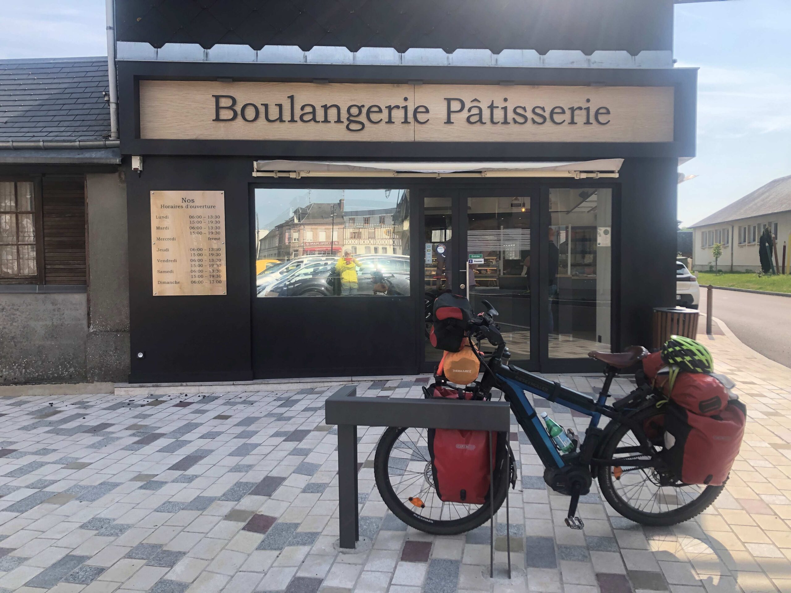 At 10:30 I had a second breakfast and stocked up on pastries, bread (baguette) and dried sausage (saucisson) at a boulangerie in Boissey-le-Châtel. That was after my first breakfast of flan and pain au raisons and a salad roll at the boulangerie in Pont de l”Arche. Sure do get hungry on these trips.