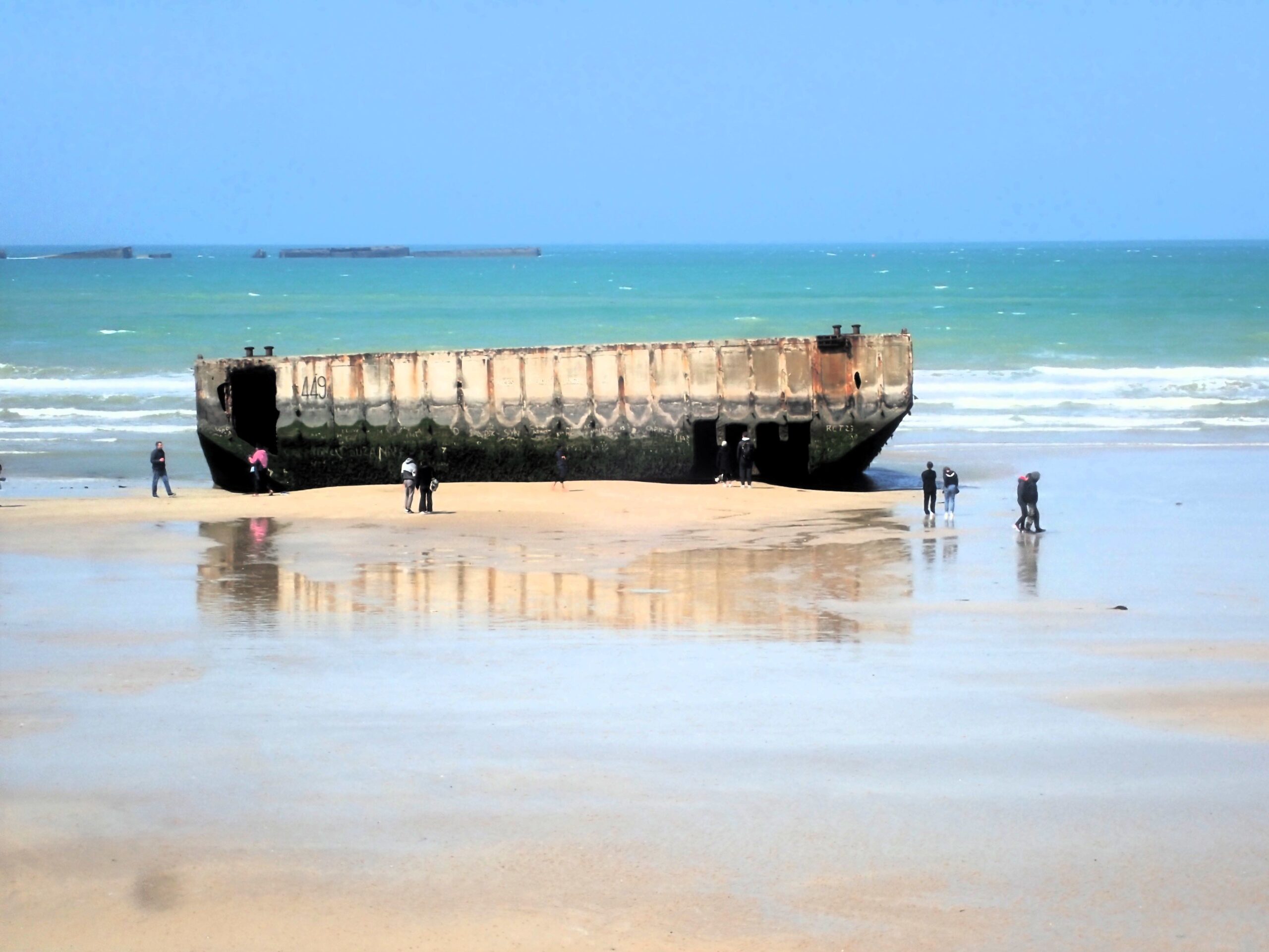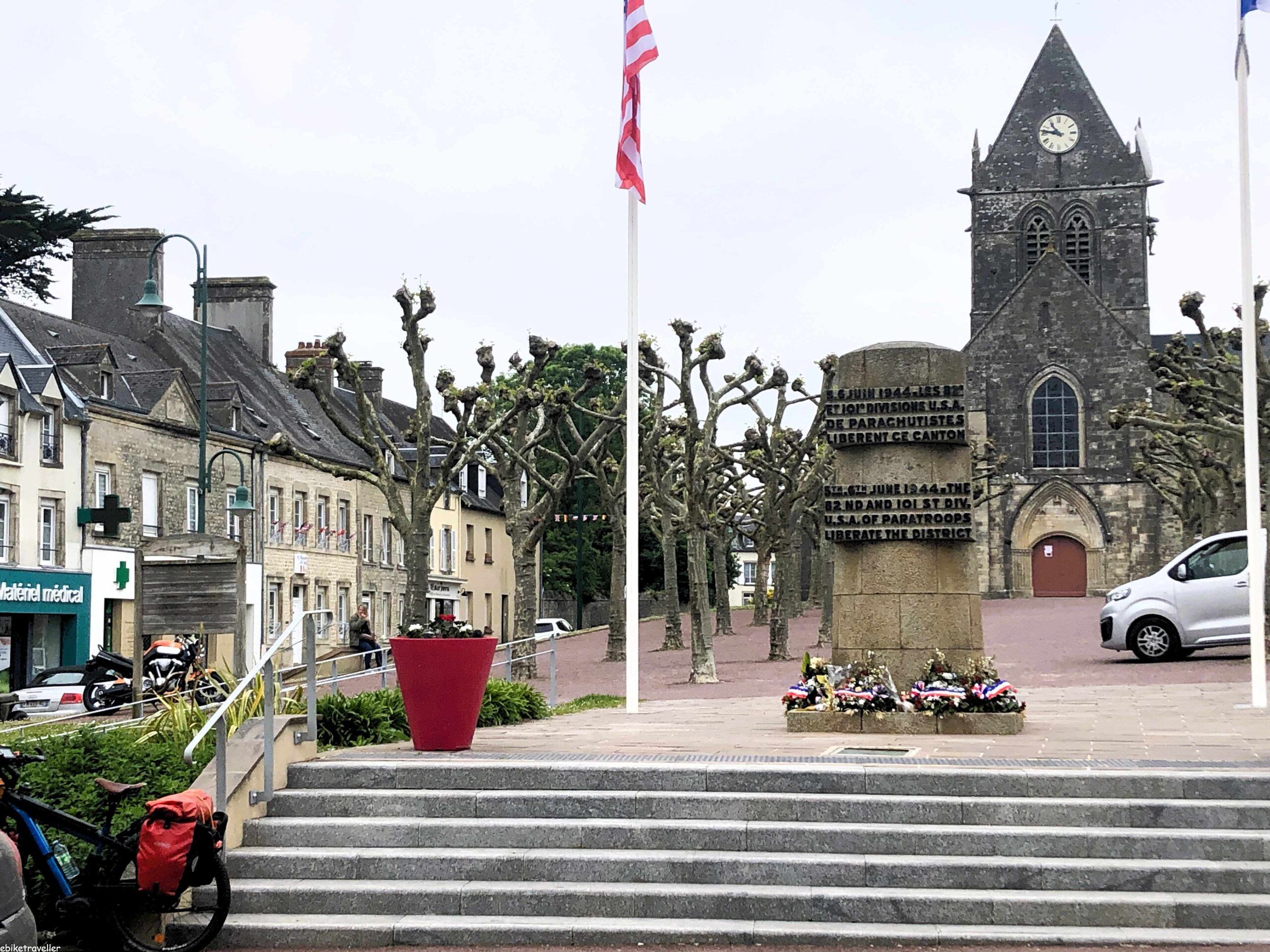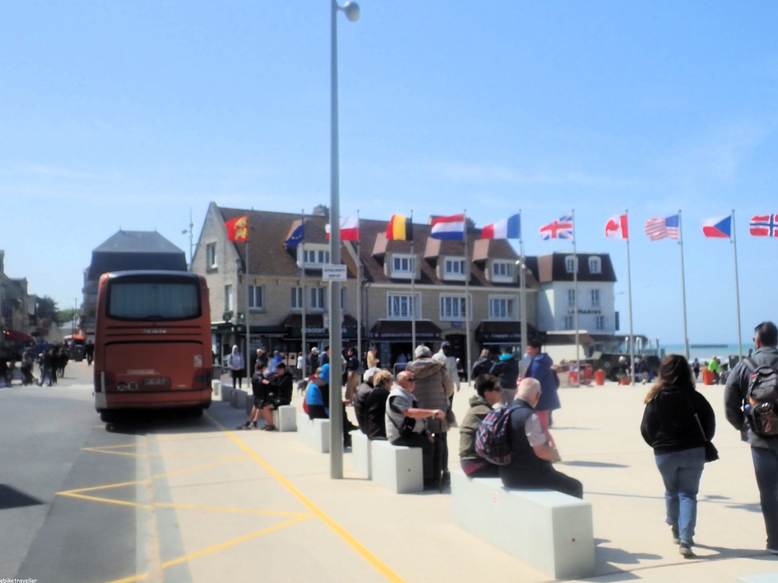 Once I got to Ouistreham, after about 35 km of cycling for the day, I was well onto the Normandy Beaches tourist trail where all things to do with the allied invasion of France on D-Day, June 6 1944 are celebrated. There are still bus-loads of mainly American and Canadian tourists coming here, and everything is geared to luring them in, with lots of US and Canadian bunting flying about everywhere. English not so much. Saw more German flags in fact, which is fair enough I suppose since without the German participation there’d be nothing to celebrate.