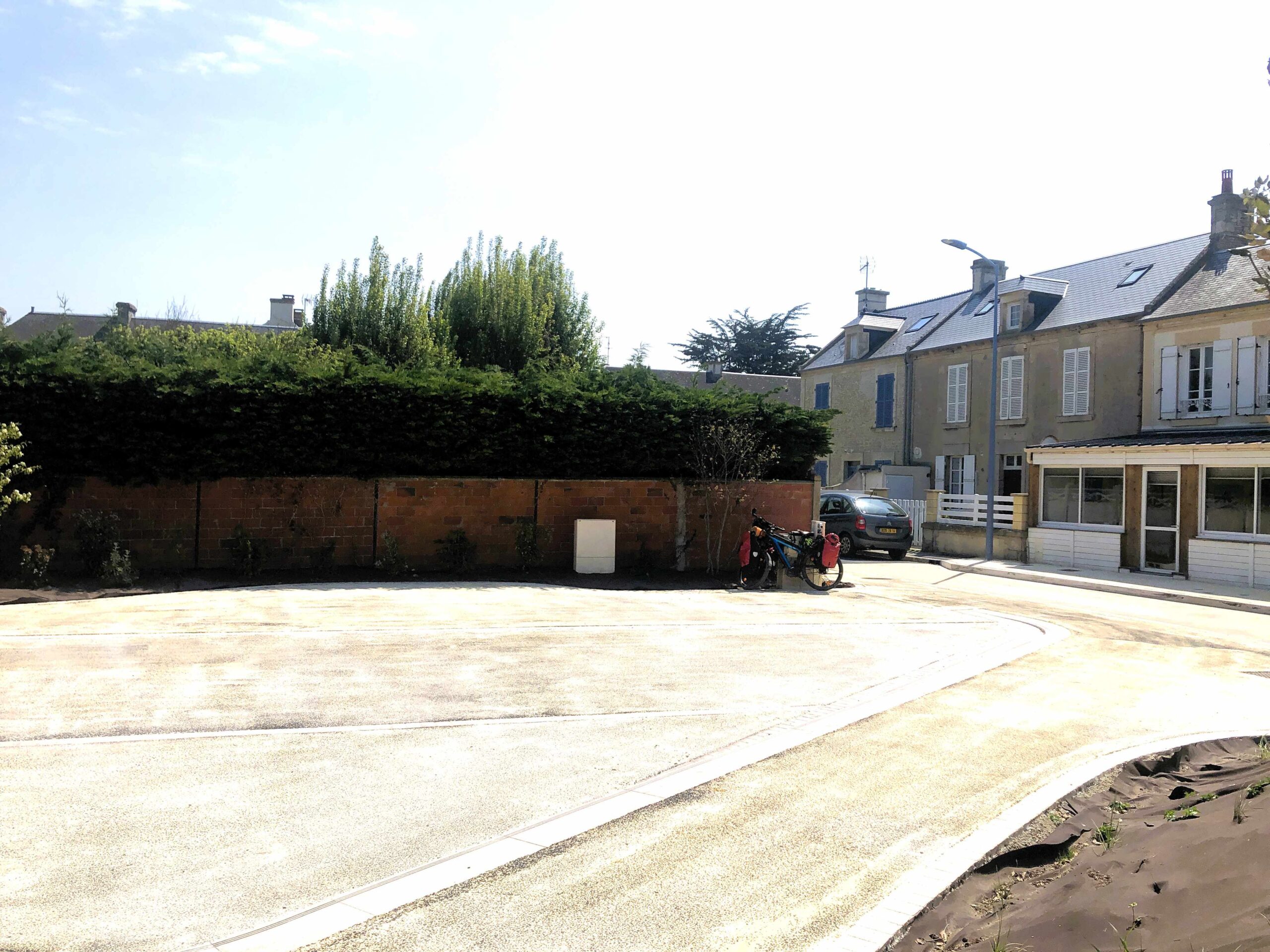 Ol’ eagle-eyes me spotted a free public charging-post in the town of Asnelles that I took advantage of from 2 to 3:30 pm that gave me the ‘legs’ to push on quite a bit further. It looked like a new RV parking-lot they’re building to entice the coveted campervan tourists to stay awhile and I took a photo of it from back on the road that I was roaring past on, just to how you how brilliant I am at noticing these life-enhancing features:
