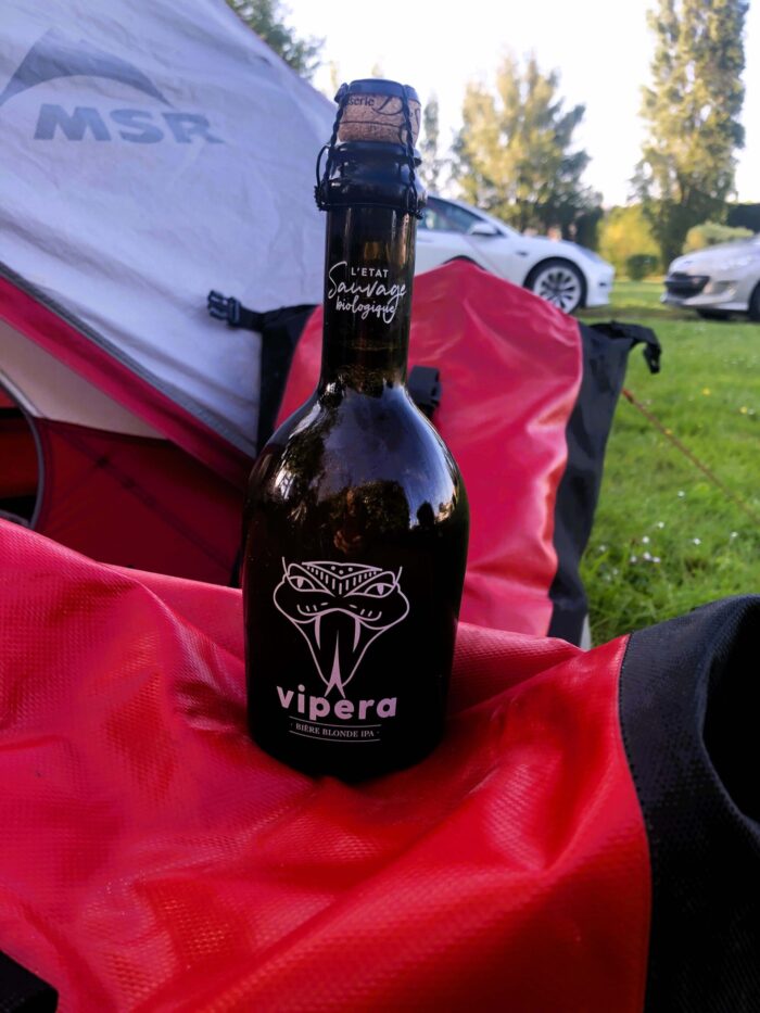 Camping sur la Plage , where I did stop, is mainly geared towards campervans and their own on-site ‘holiday cottages’, and the rest of us – us tenters – only get in under suffrance it seems. I was jammed into a corner pitch next to a large family group way out in Siberia miles away from any facilities and the restaurant/ bar area. It wasn’t expensive – €15 – but the people running it were rude and unfriendly.